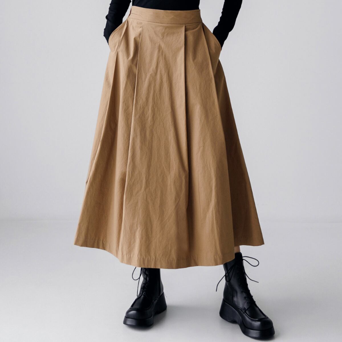ウエストから裾にかけてふんわりと広がるフレアシルエットは、気になるヒップや太ももをさりげなくカバー。ウエストはタックデザインですっきり見せ、スタイルアップ効果も期待できます。