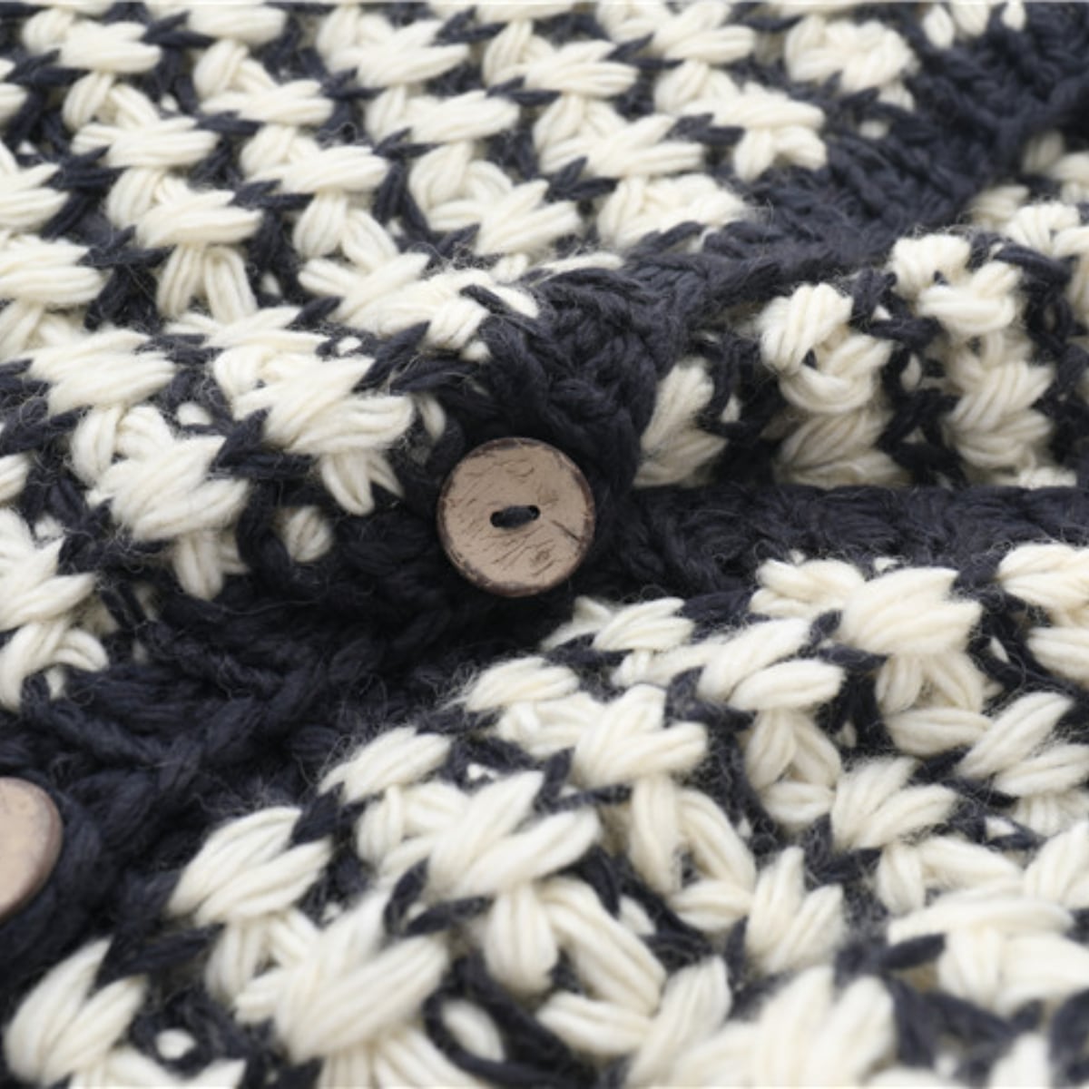 ぽってりとしたパフスリーブと、大胆なシェブロン柄が目を引くニットカーディガン。