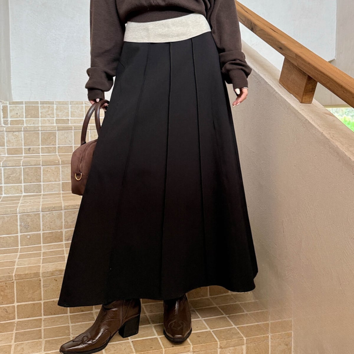 上品なドレープ感と、歩くたびに美しく広がるシルエットが魅力のマキシ丈スカートです。