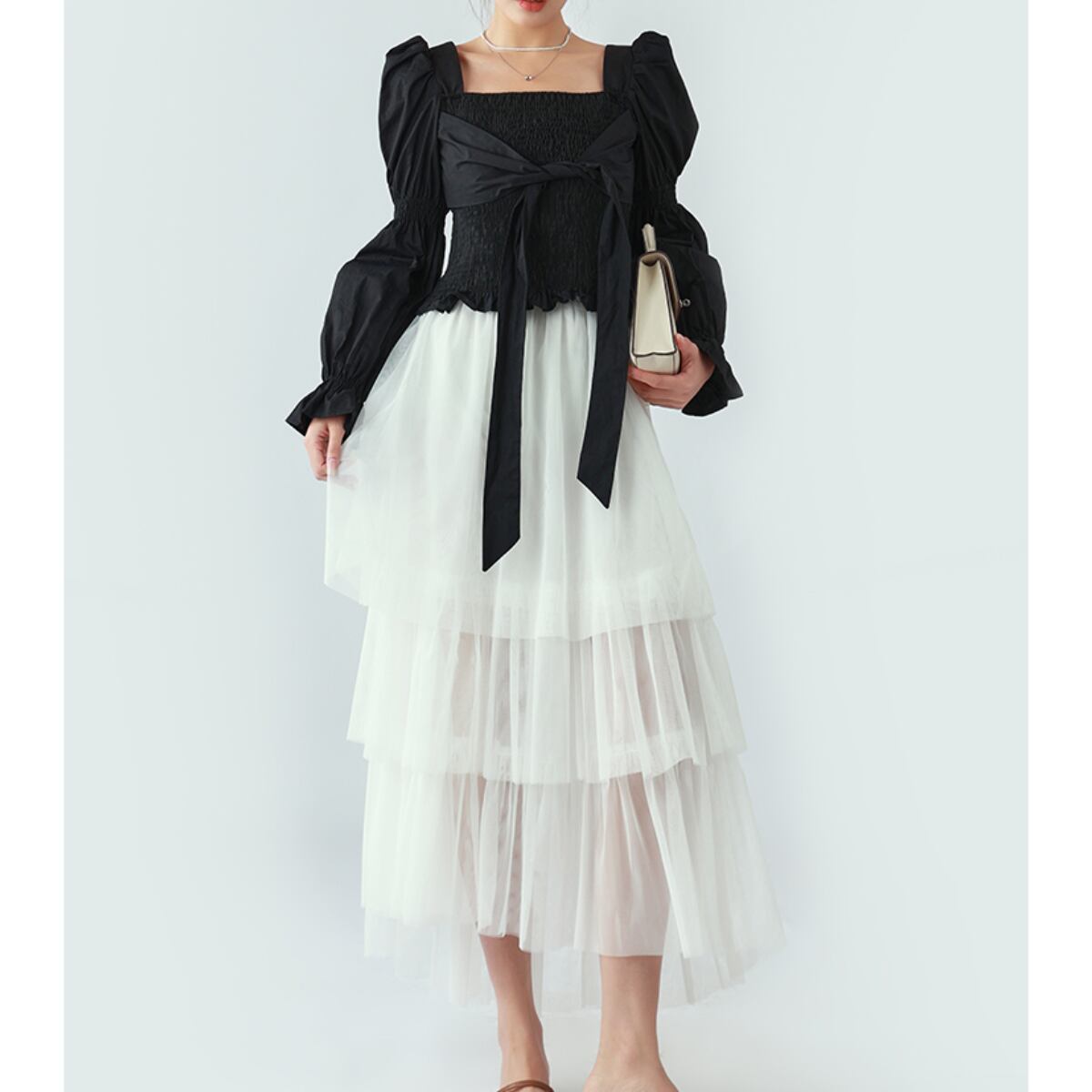 ふんわりとしたパフスリーブと、胸元のシャーリングデザインが特徴のブラウス。リボンは結び方次第で雰囲気を変えられます。