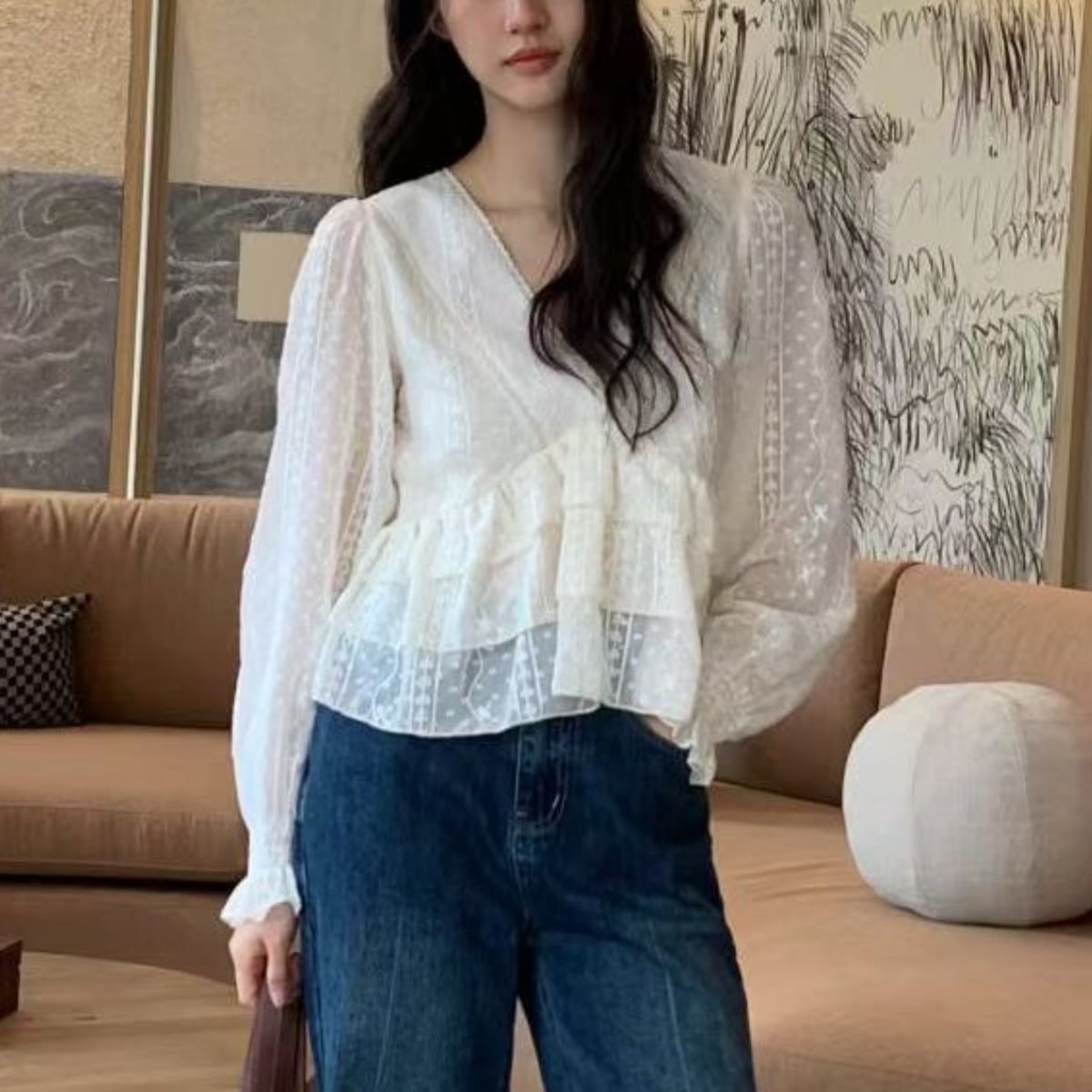 Embroidered Lace V-Neck Ruffle Blouse ch0145