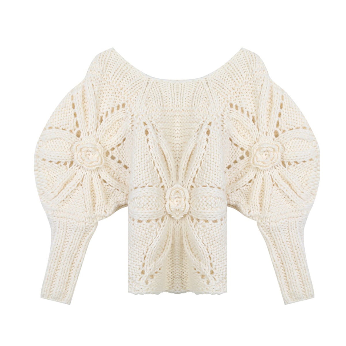 肩から肘にかけて大胆に膨らむパフスリーブと、立体的なフラワーモチーフが印象的なニットです。