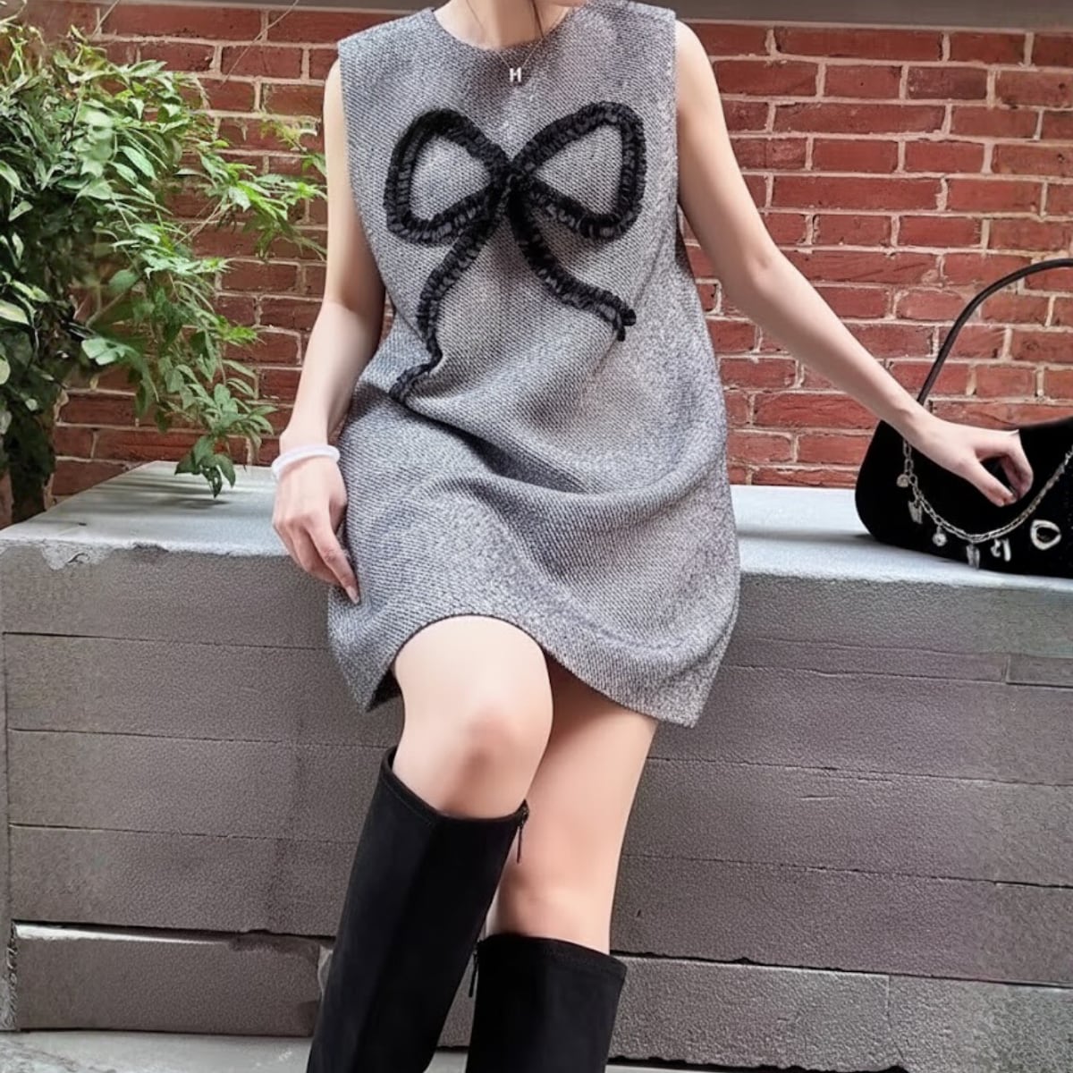 表情豊かなツイード素材に、立体的なブラックリボンモチーフを大胆にあしらったノースリーブワンピースです。