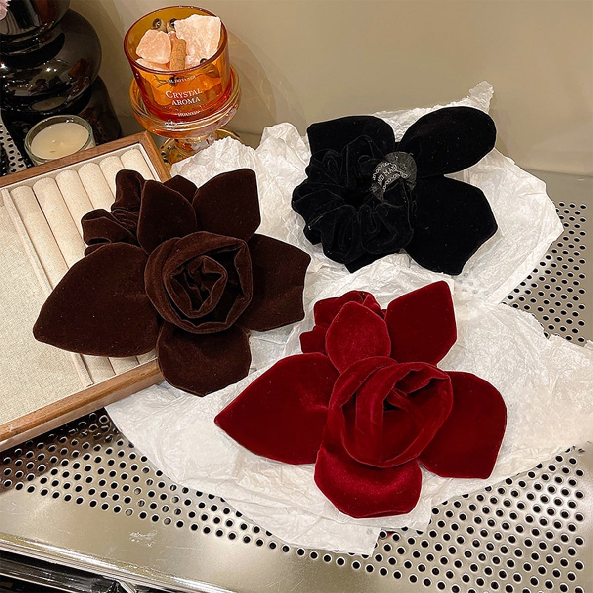 立体的なフラワーモチーフをあしらった、存在感抜群のベルベットシュシュ。