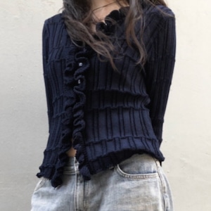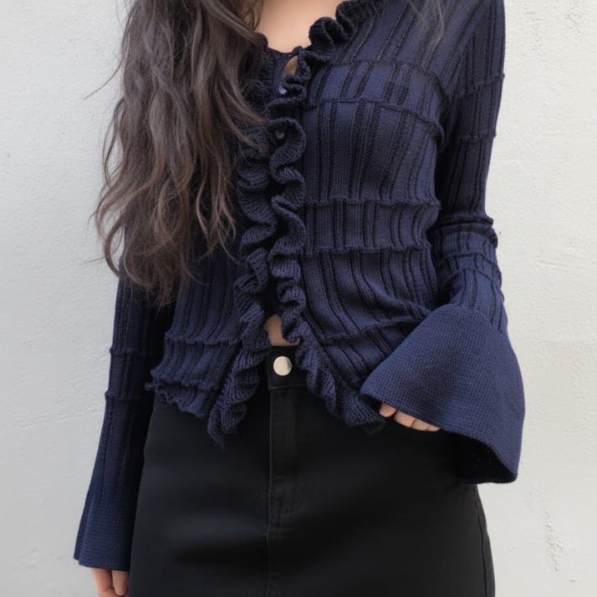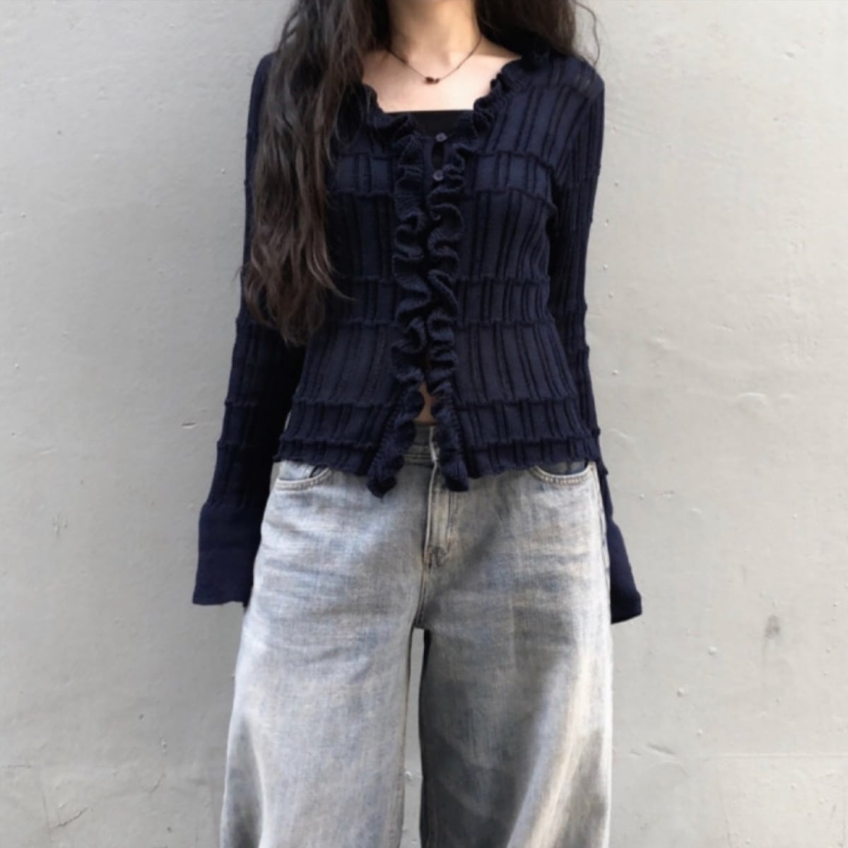 Ruffle Trim Rib-Knit Cardigan ch0075