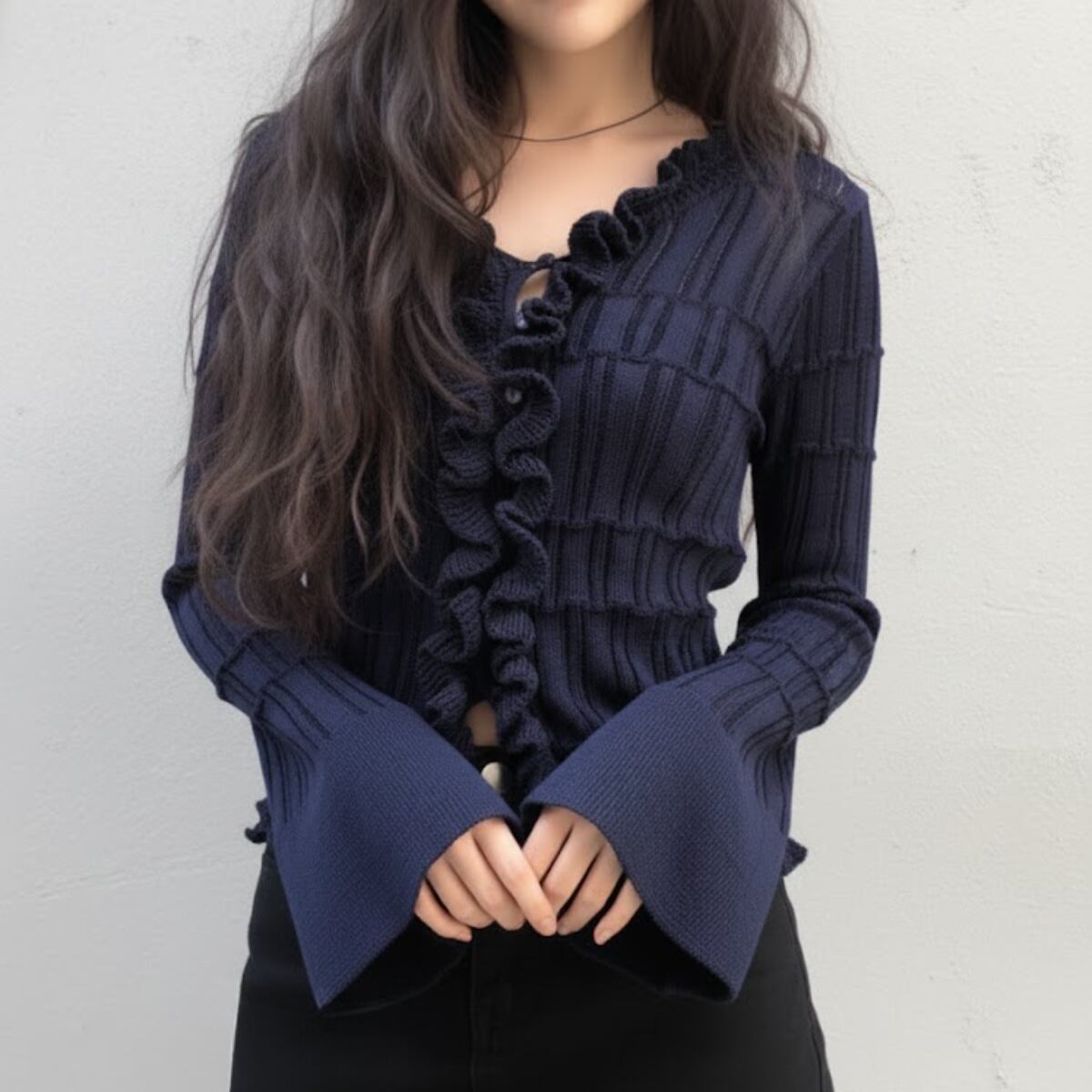 Ruffle Trim Rib-Knit Cardigan ch0230
