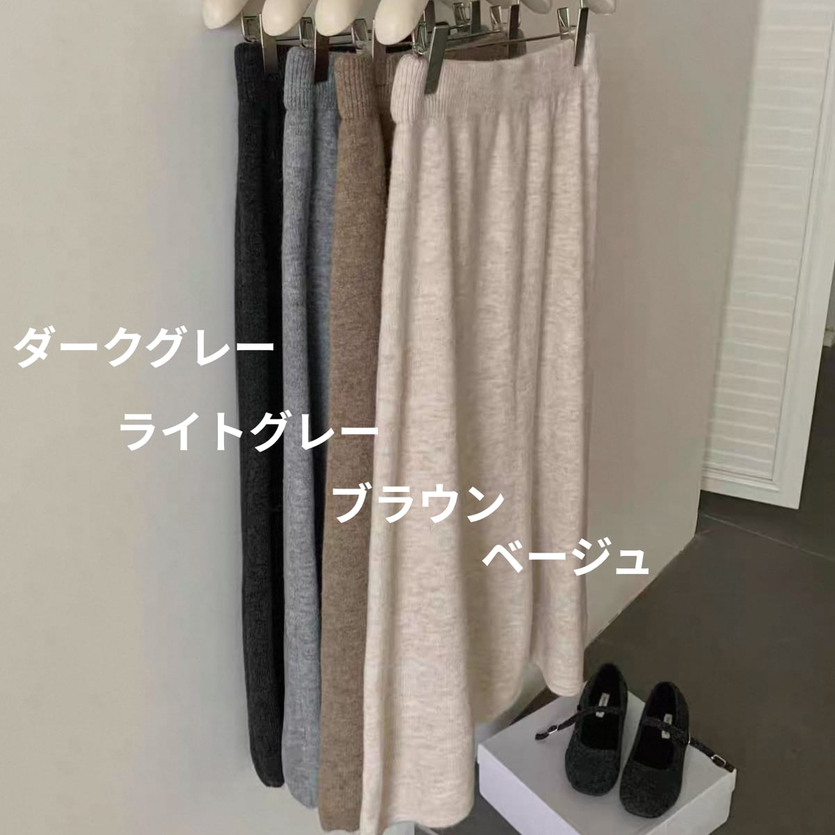 スカートは裾に向かって緩やかに広がるフレアシルエットのロングスカートで、体型を拾いすぎず、美しいドレープを生み出します。