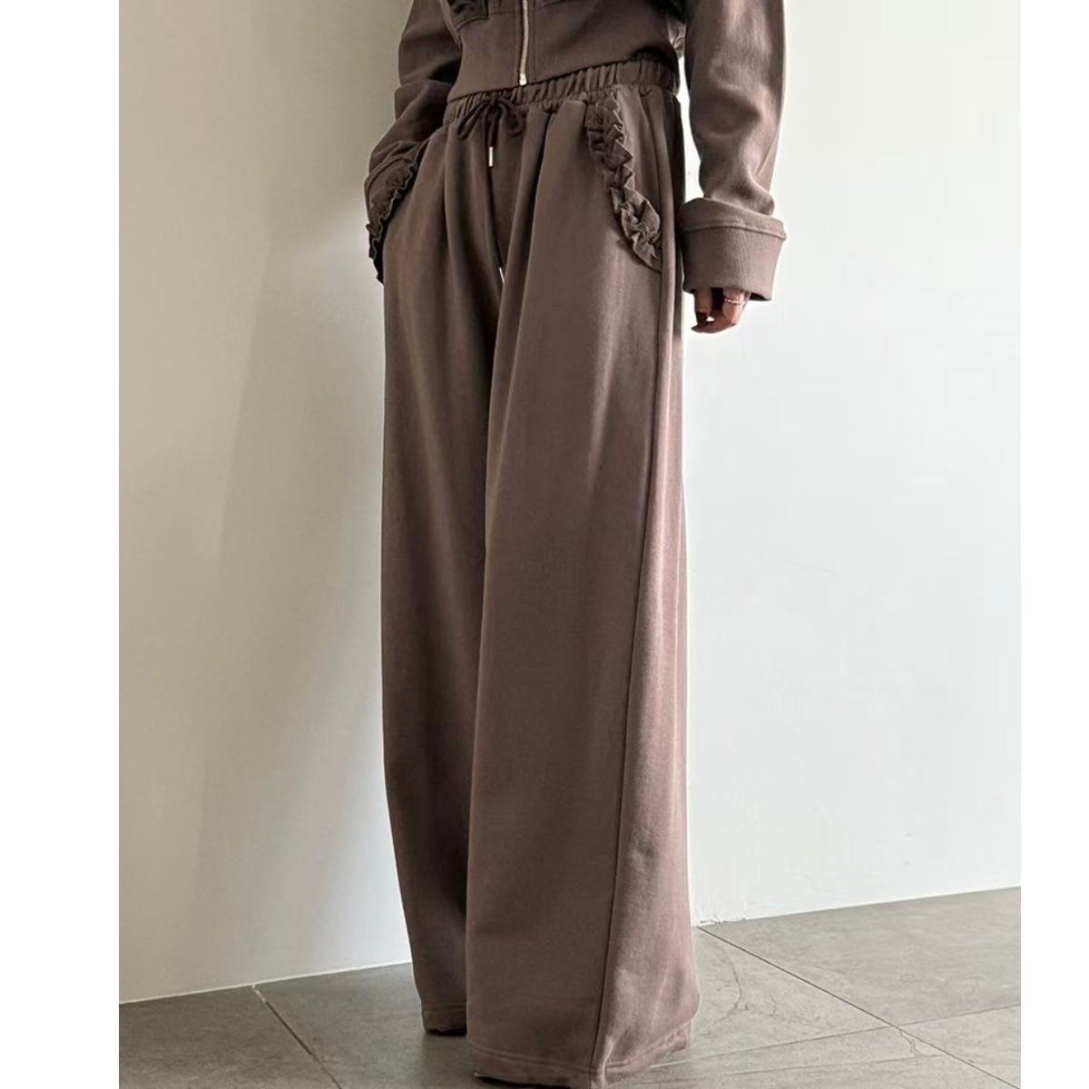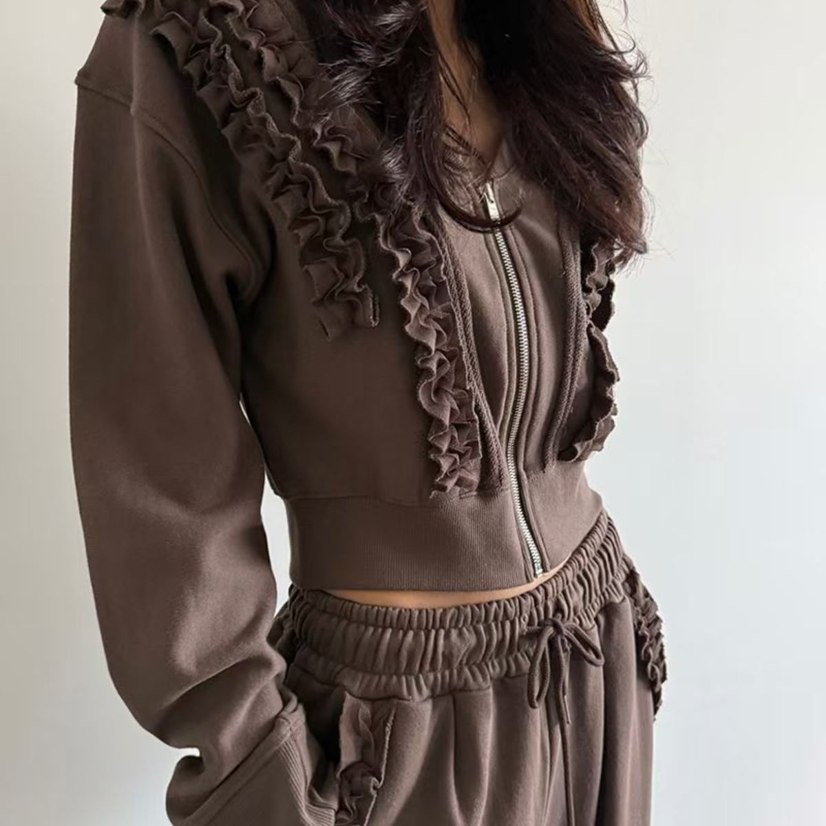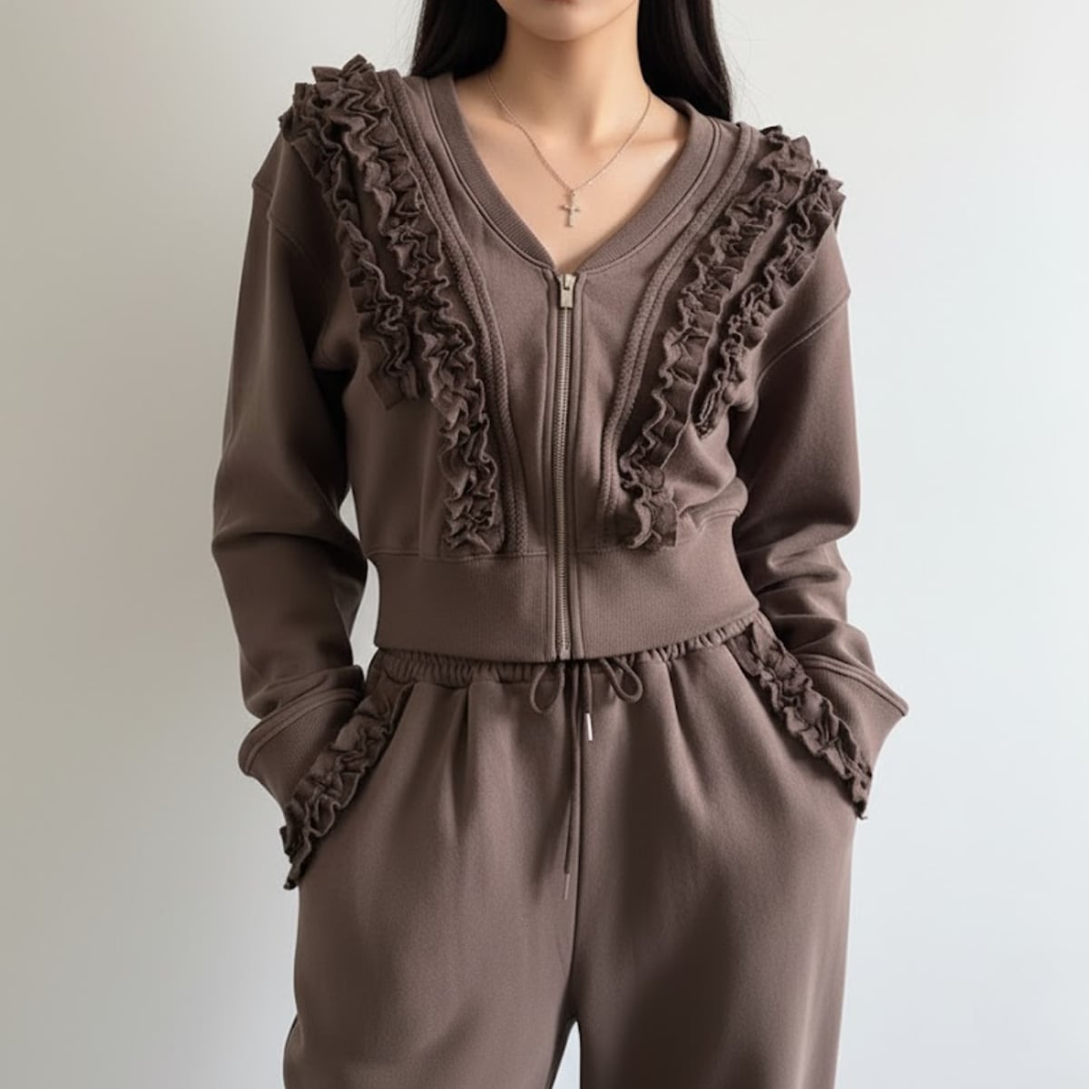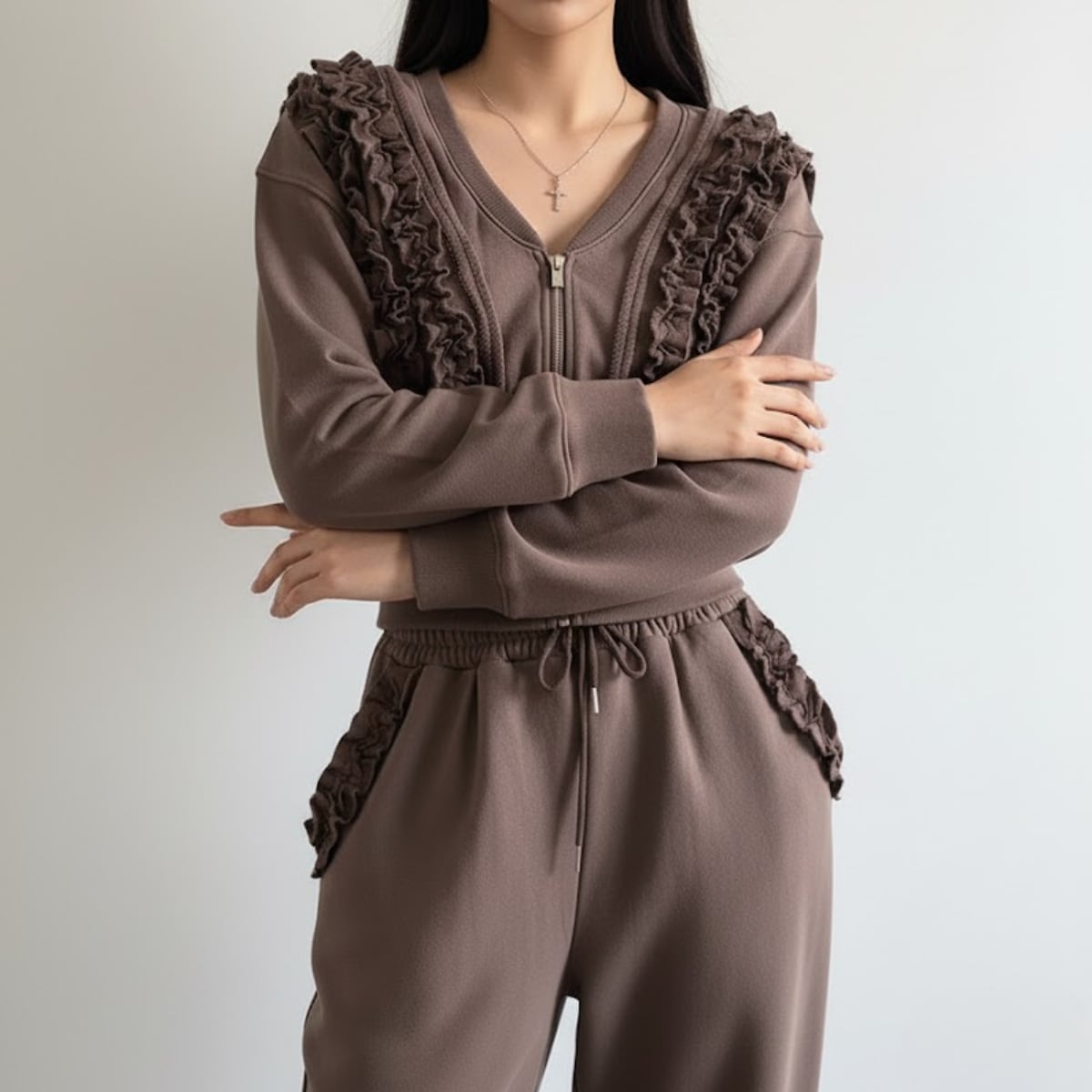 スウェット素材に、華やかなラッフルフリルをあしらったジップアップパーカーとジョガーパンツのセットアップです。