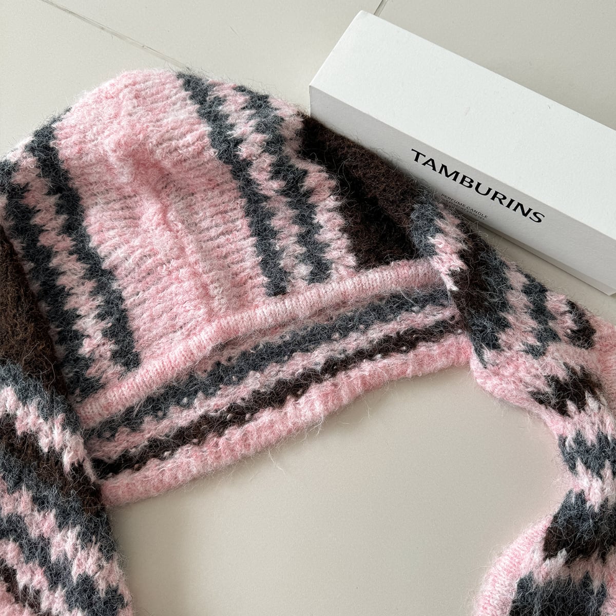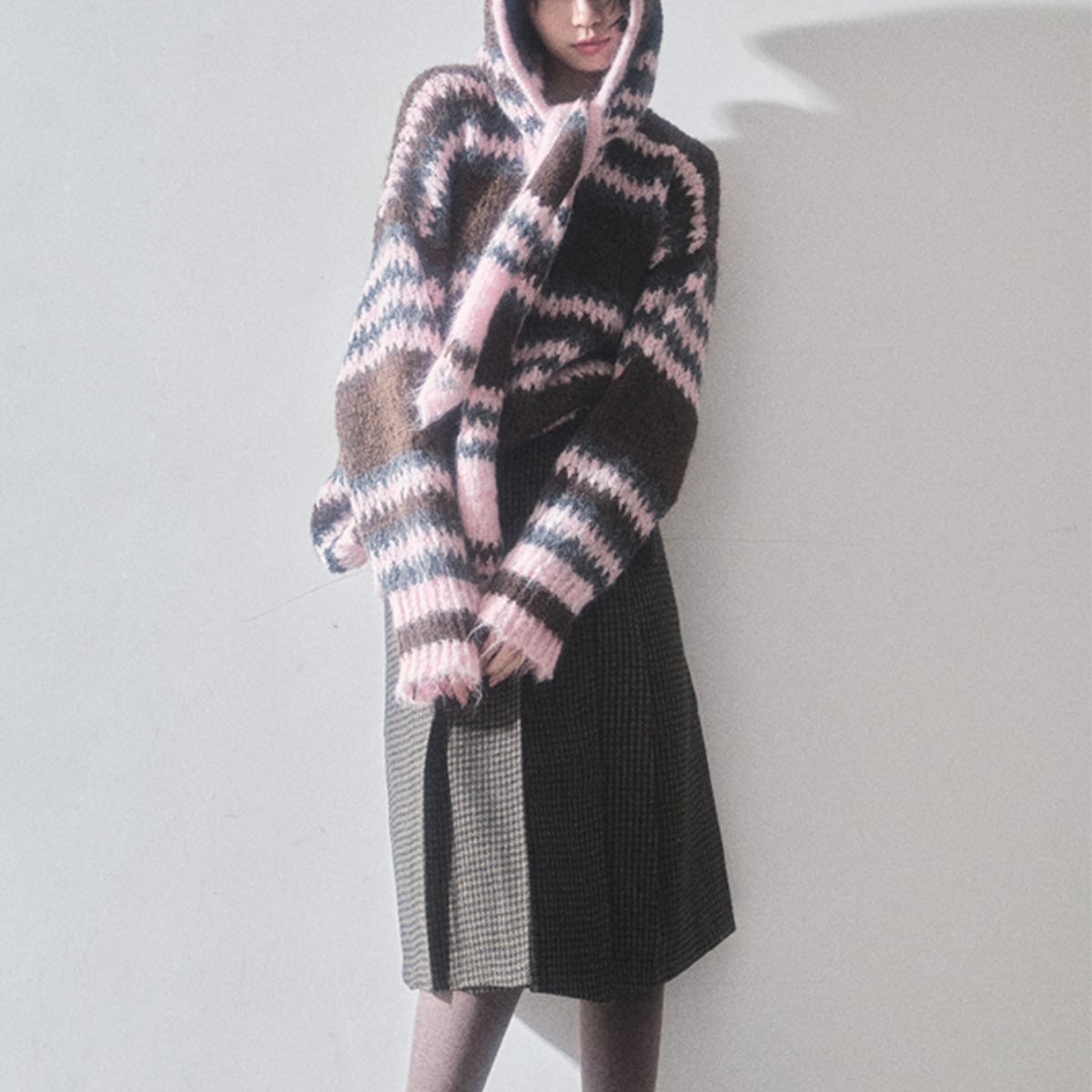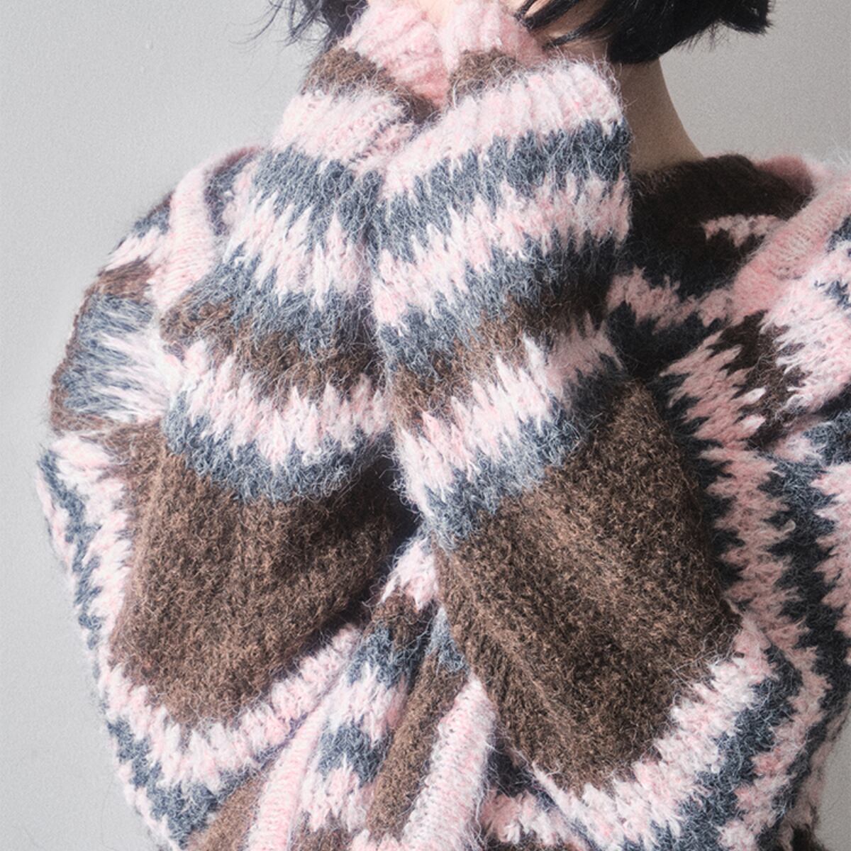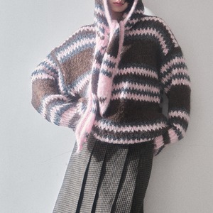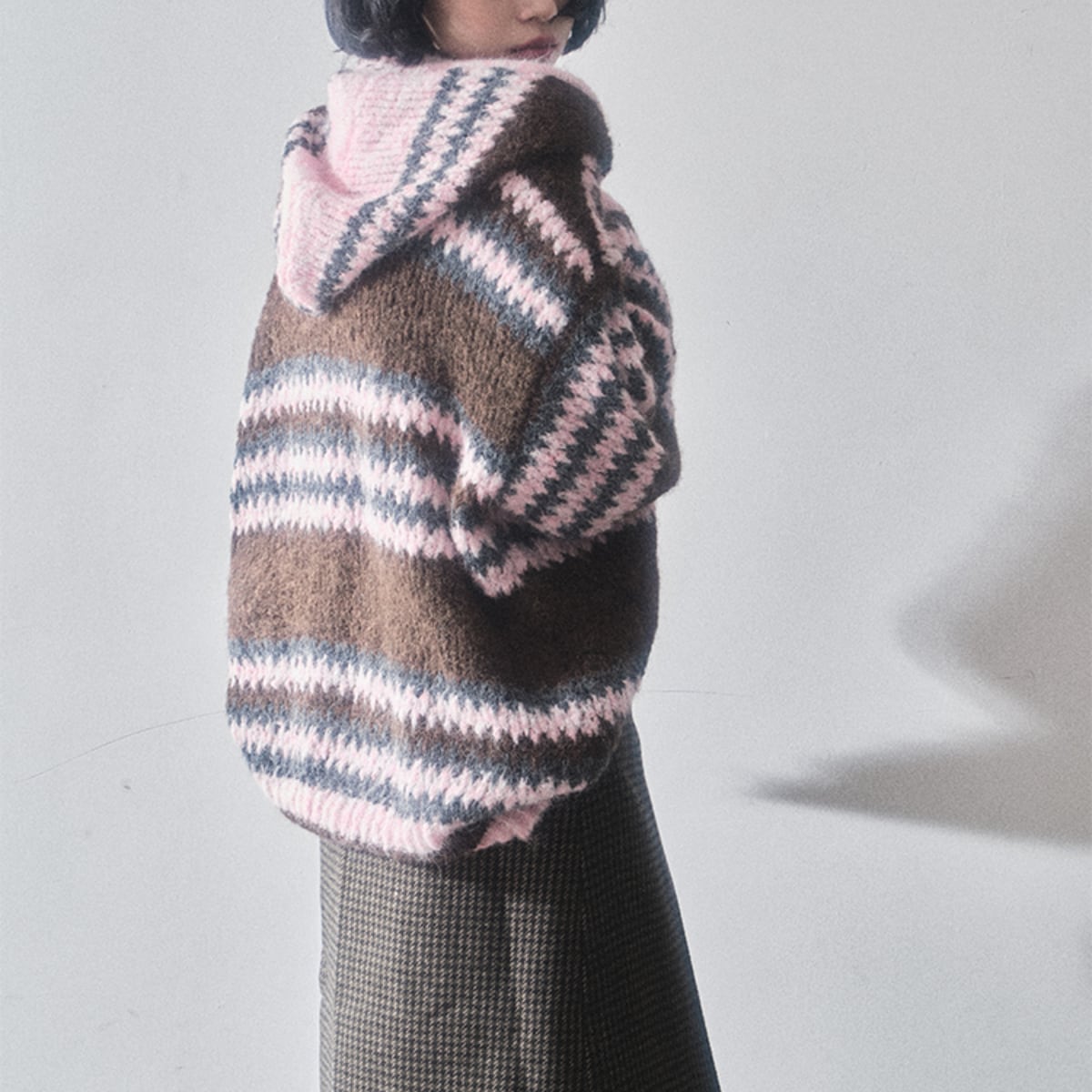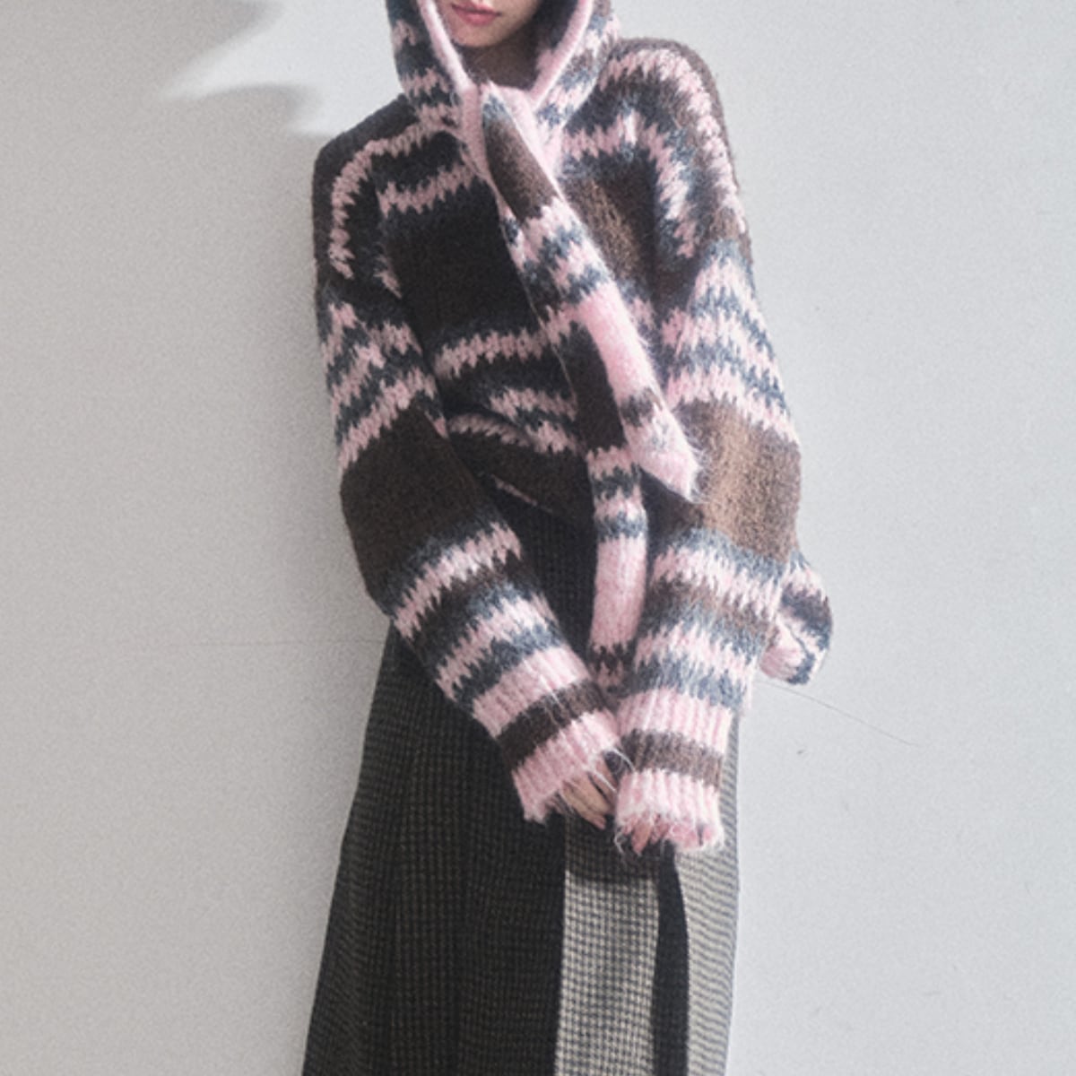 ブラウンを基調に、クールなグレーと柔らかなピンクを組み合わせた多色ボーダー柄が特徴で、カジュアルでありながらも洗練された印象を与えるニットセーターです。