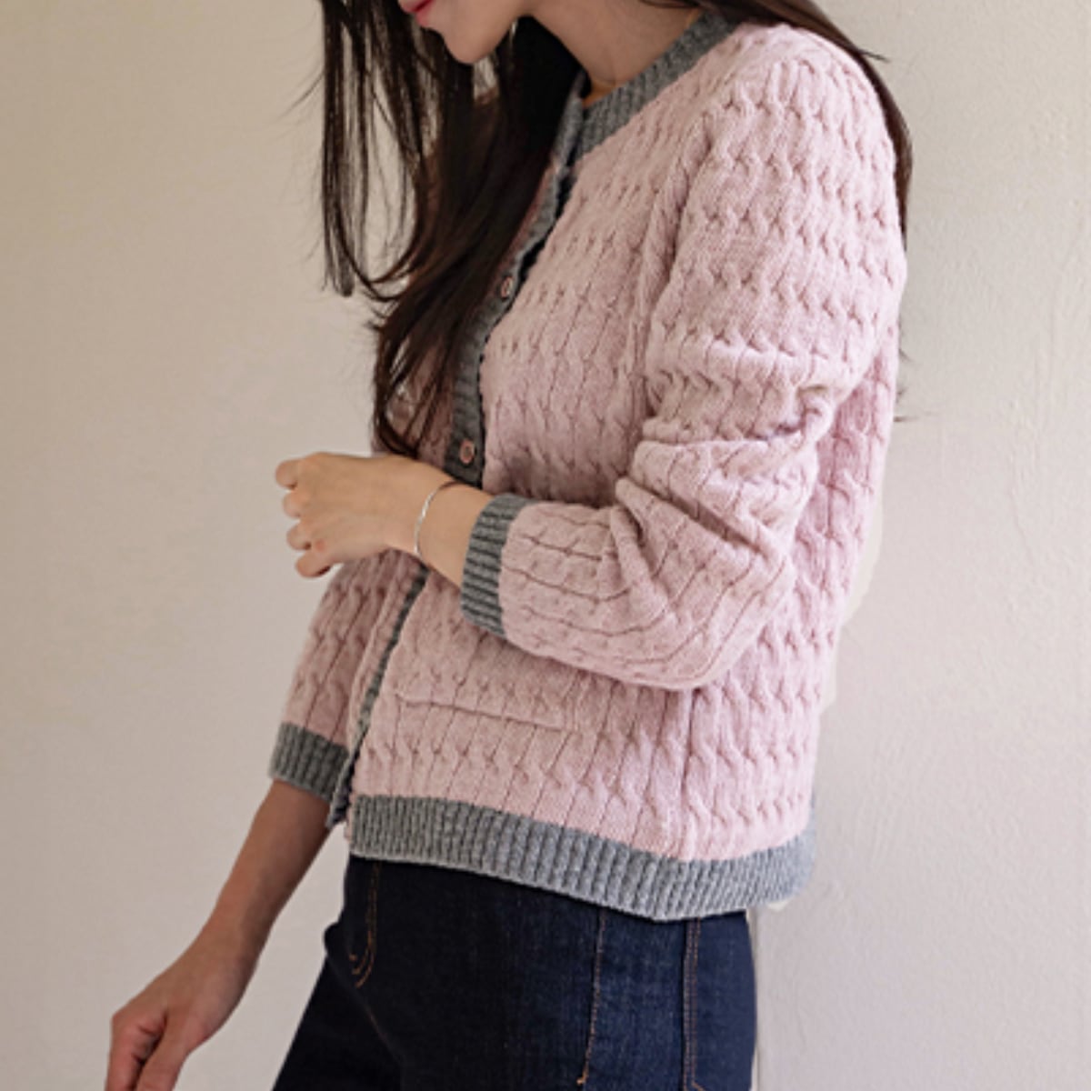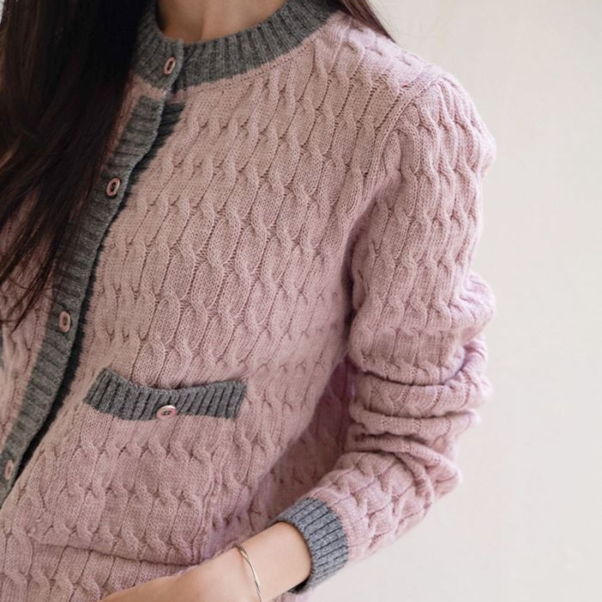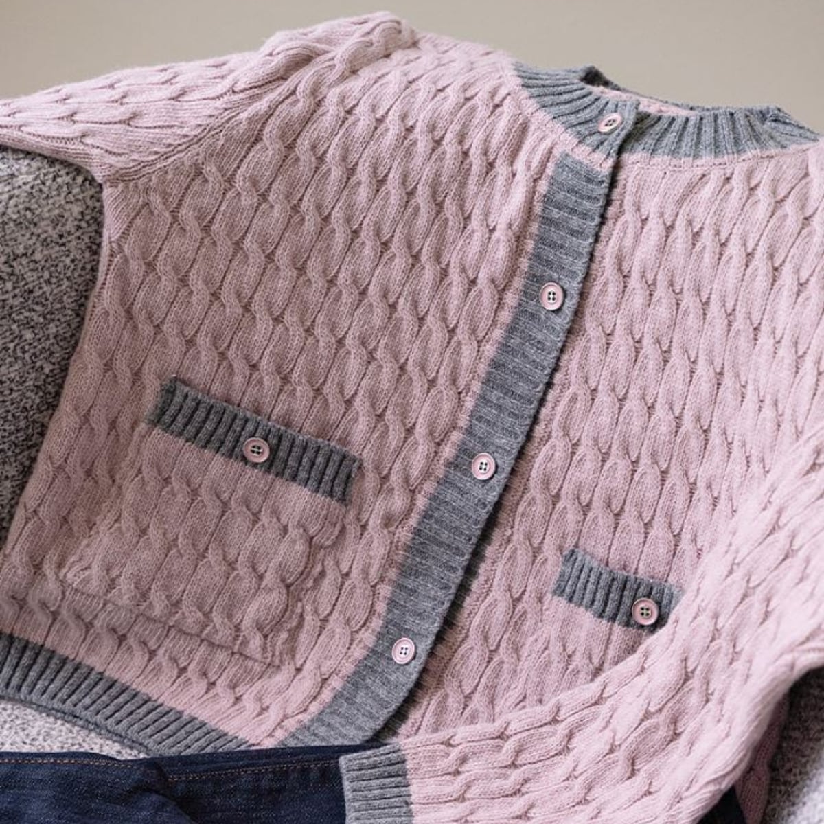 立体感のあるパターンと、襟元・袖口・裾にあしらわれたコントラストカラーの配色がポイントです。クラシックながらも洗練された雰囲気を演出し、日常のスタイルをワンランクアップさせます。
