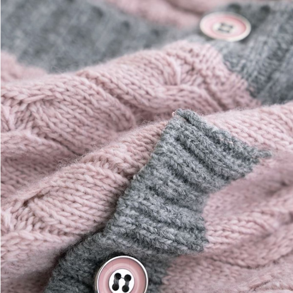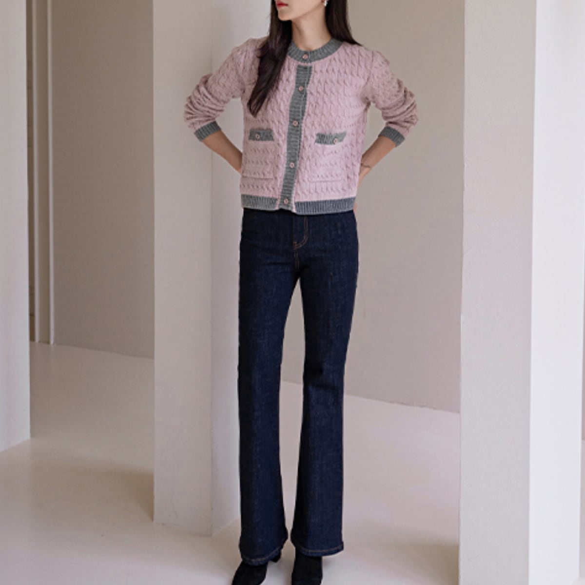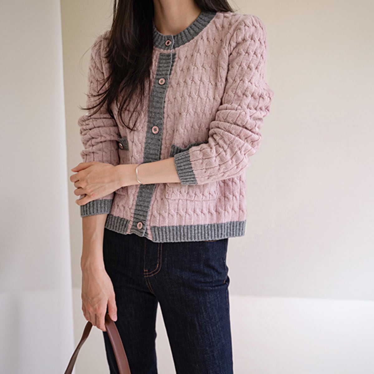 立体感のあるパターンと、襟元・袖口・裾にあしらわれたコントラストカラーの配色がポイントです。クラシックながらも洗練された雰囲気を演出し、日常のスタイルをワンランクアップさせます。
