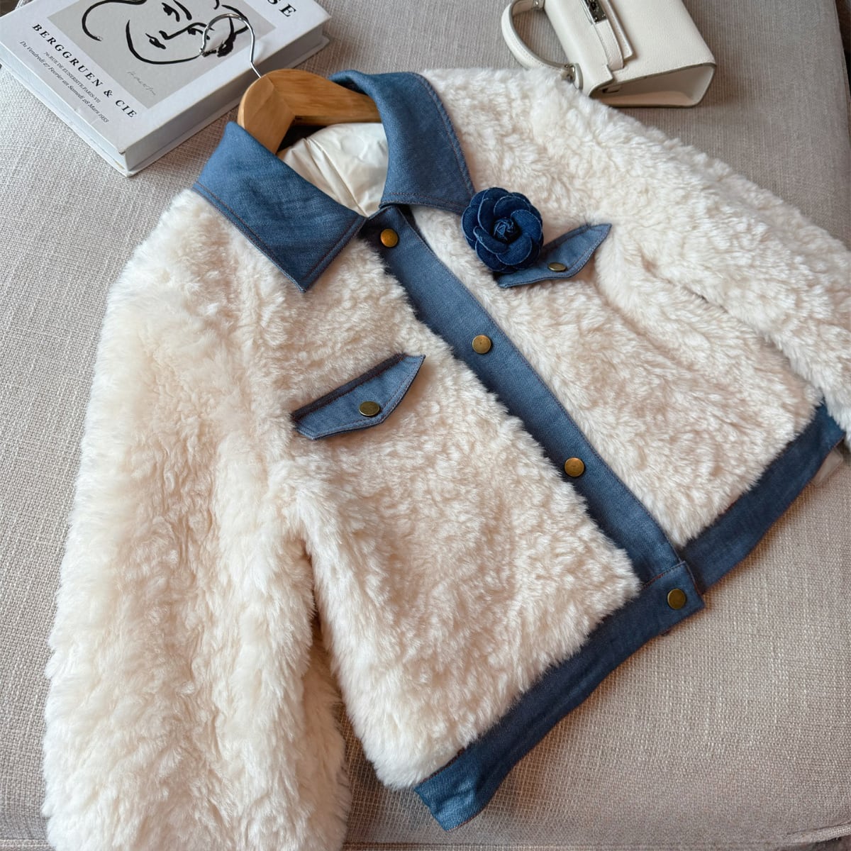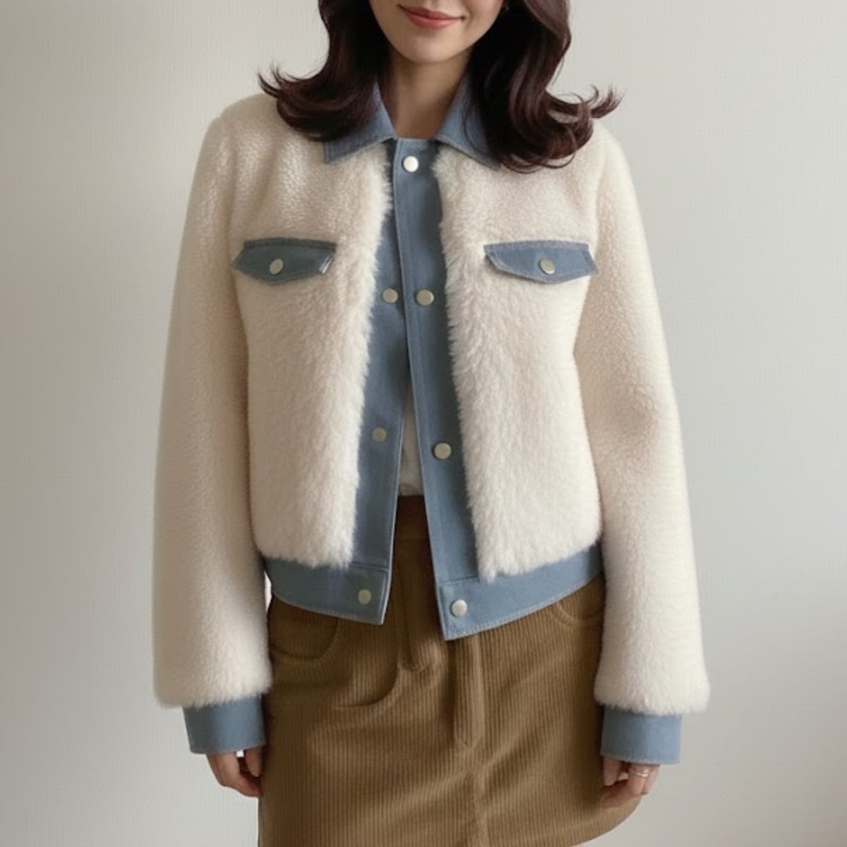 ふわふわとしたテディフリースをボディに採用し、暖かさと見た目の愛らしさを追求しました。襟、袖口、ポケット、裾には、クラシックなライトブルーのデニム素材をパッチワークのように配置することで、カジュアルながらも洗練された大人のコントラストを生み出しています。