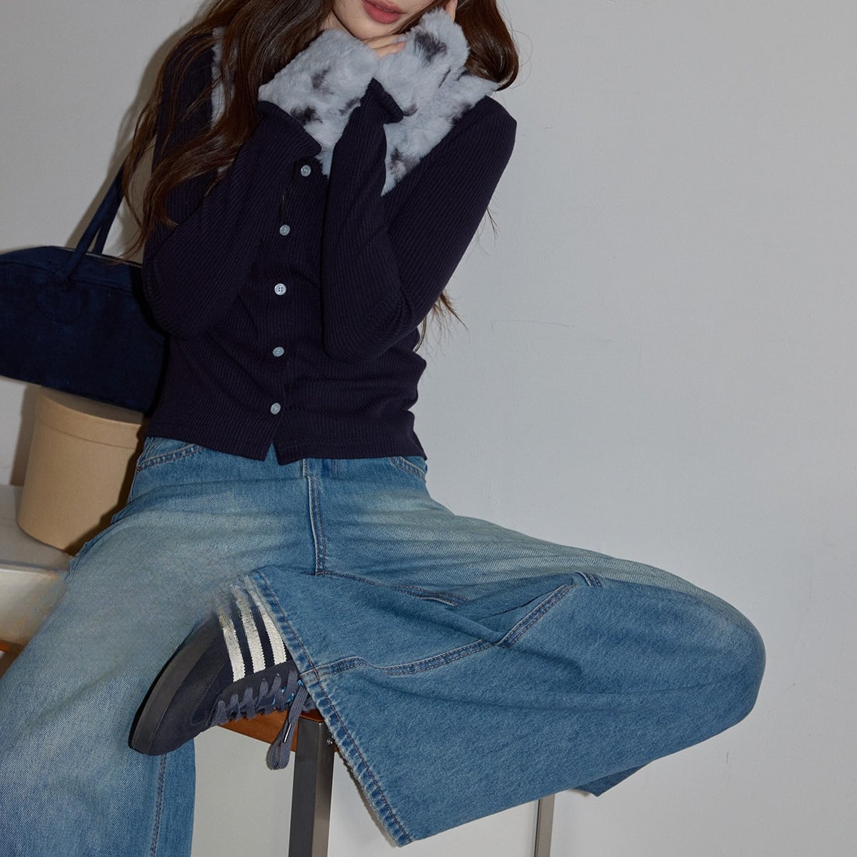 最大の魅力は、ふわふわのフェイクファーがあしらわれた襟と袖口です。遊び心のあるドット模様のファーが、顔周りと手元を華やかに彩り、レトロで可愛らしい雰囲気を演出します。