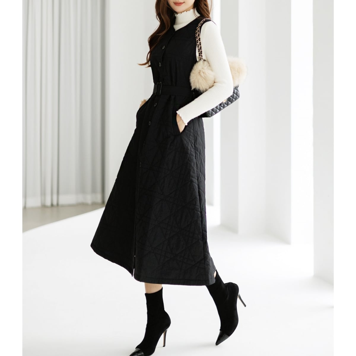 最大の魅力は、3WAYで活躍する点にあります。全体を重ねて着れば、ロングコートのような存在感のあるアウターとして。ジャケットを単体で使えば、手持ちのアイテムと合わせてカジュアルダウンした着こなしに。そして、ワンピースは、タートルネックやブラウスをインナーにすれば、クラシカルで洗練されたノースリーブワンピースとして楽しめます。