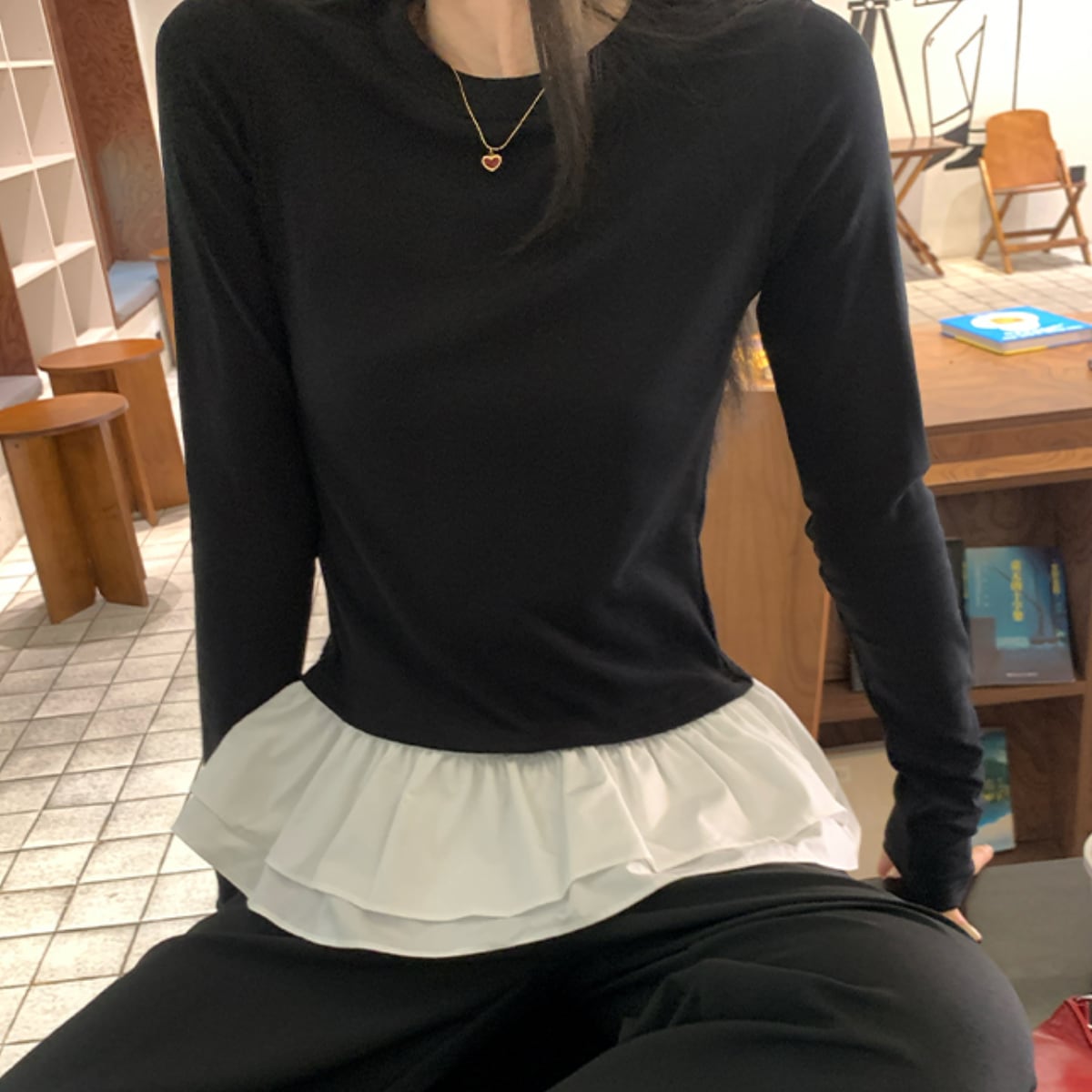 ニットやトレーナー、短丈スウェットなどの下にこのカットソーを着るだけで、裾からフリルが覗き、一気にこなれ感のある上級者スタイルが完成します。