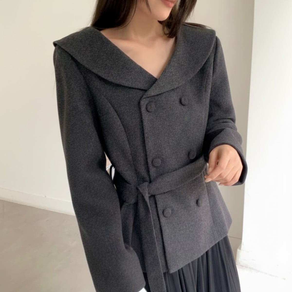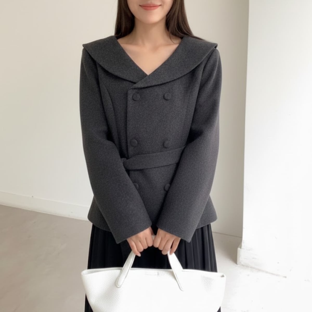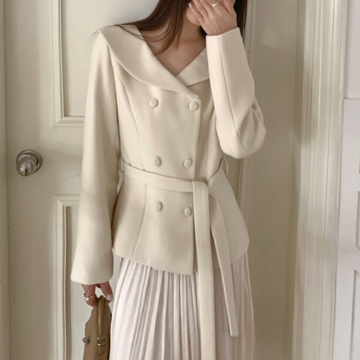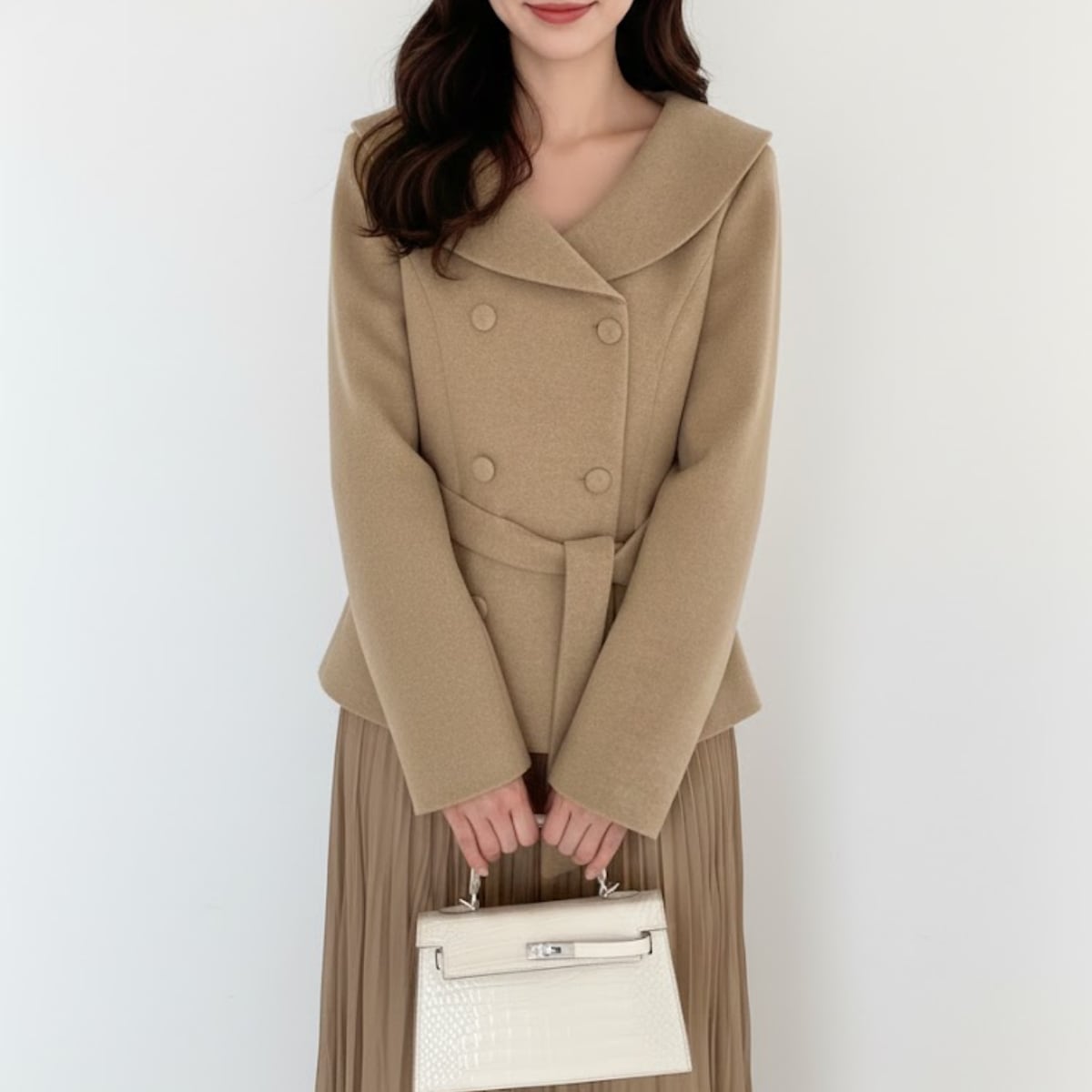 共布のベルトでウエストをマークすることで、女性らしいメリハリのあるシルエットが完成します。ダブルブレストのボタンがクラシカルなアクセントを添え、洗練された印象に。