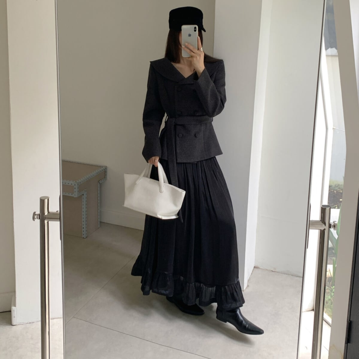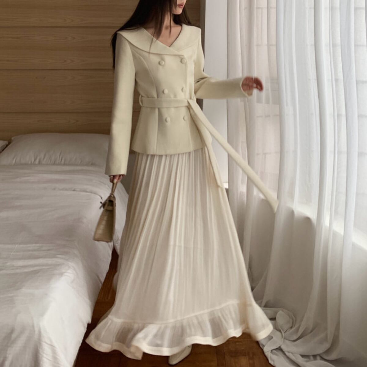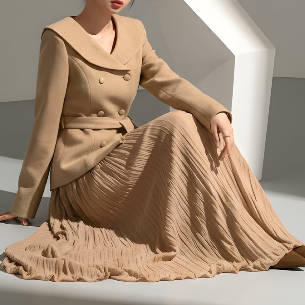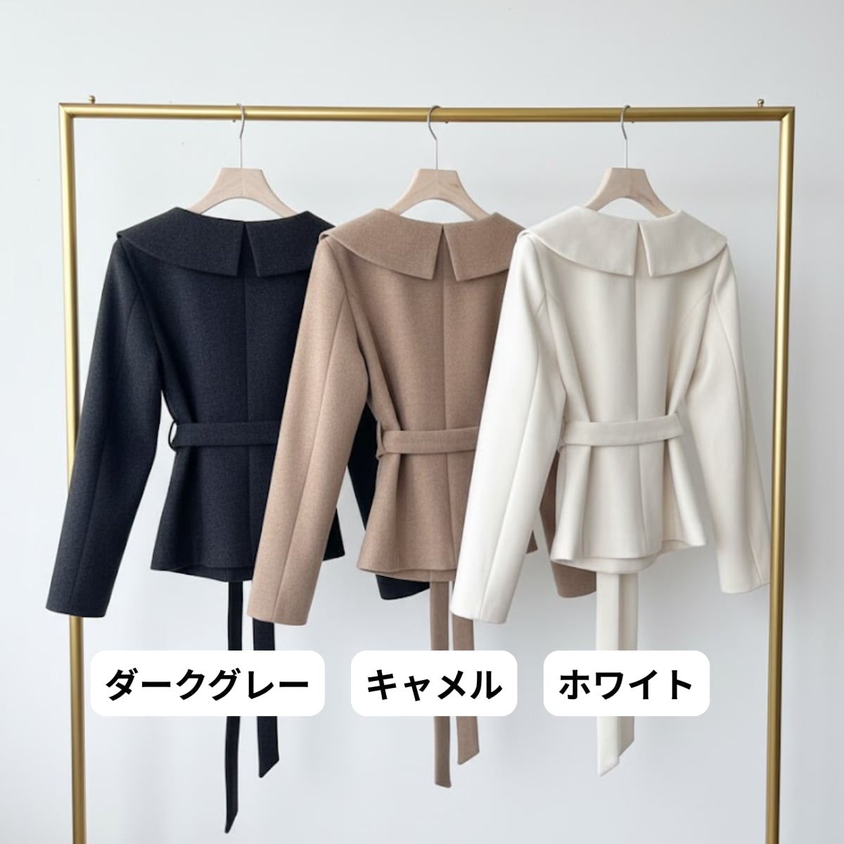 共布のベルトでウエストをマークすることで、女性らしいメリハリのあるシルエットが完成します。ダブルブレストのボタンがクラシカルなアクセントを添え、洗練された印象に。