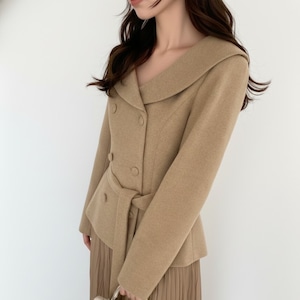 顔周りを華やかに彩る、幅広のショールカラーが印象的なショート丈のジャケットです。この特徴的な大きな襟は、立体的なドレープを生み出し、エレガントでありながらモダンな雰囲気を演出します。