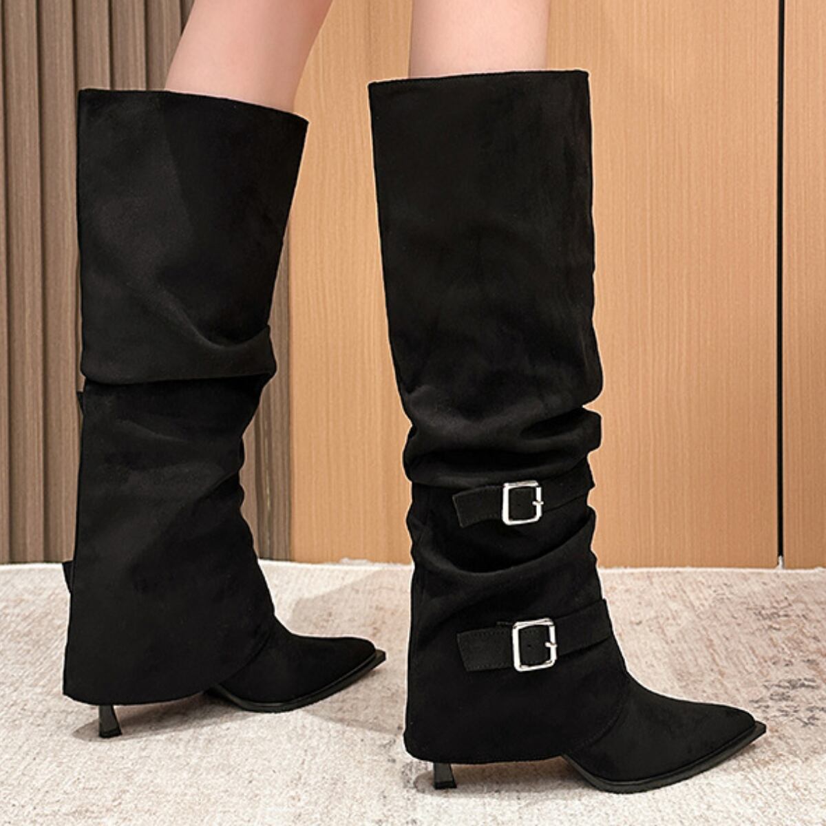 Buckle-Strap Shirring Suede-Look Long Boots ch0066