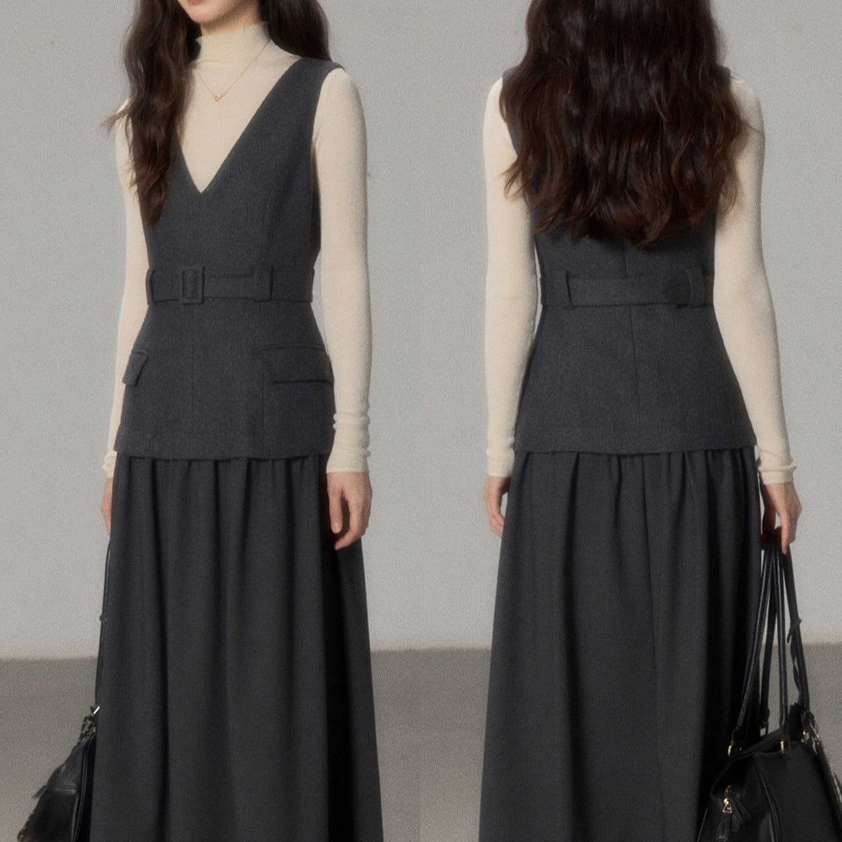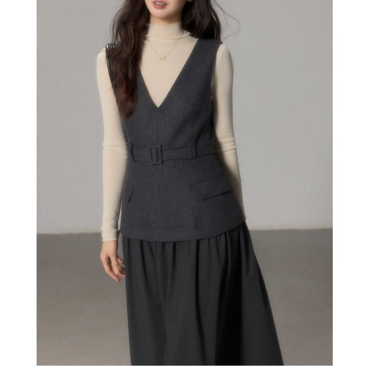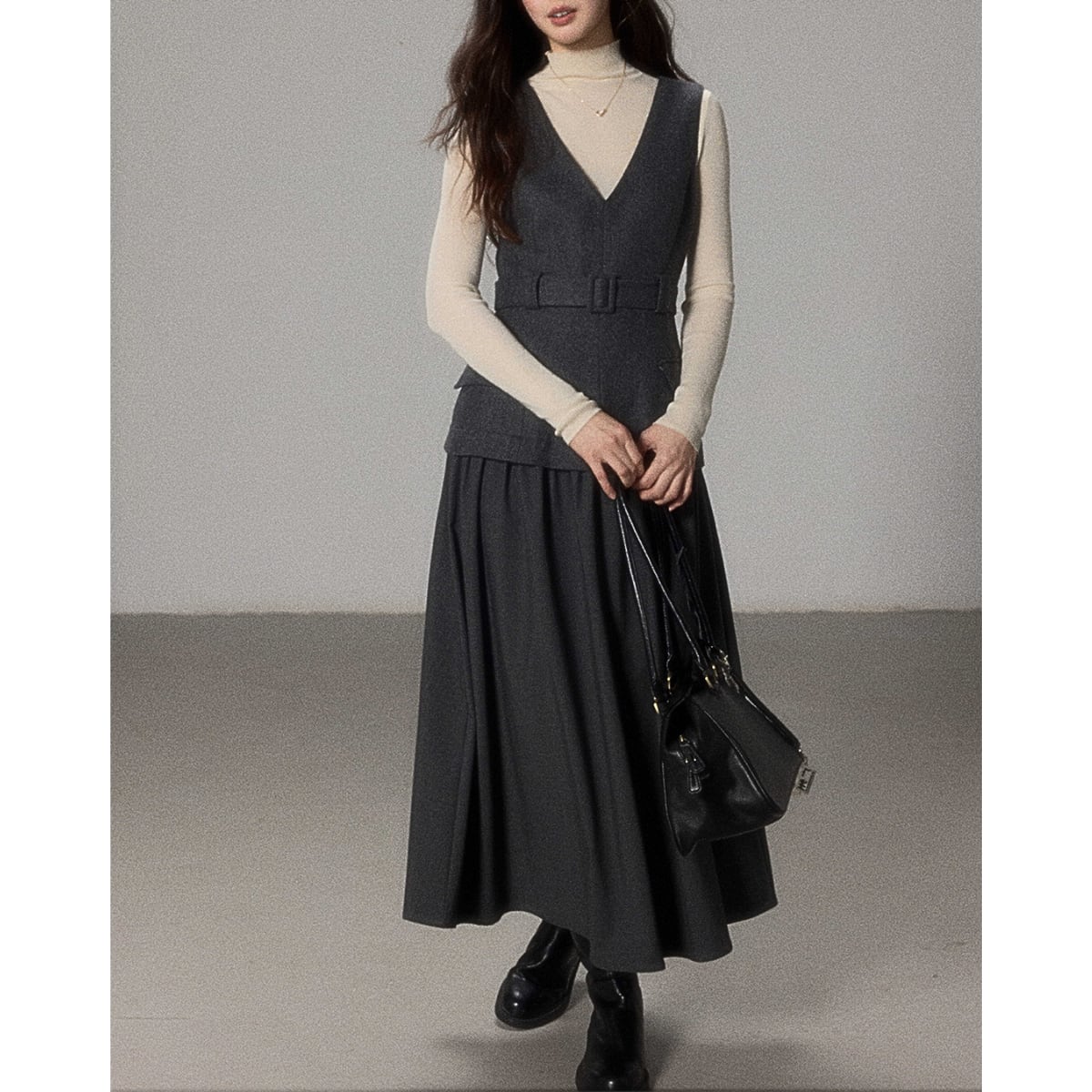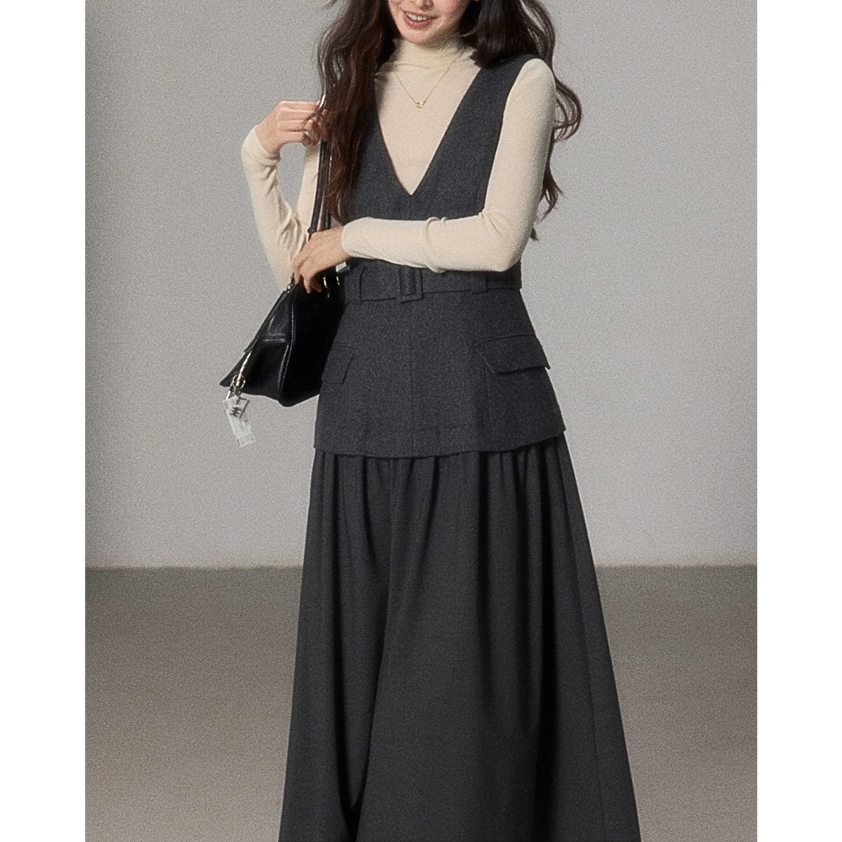 トップスのVネックベストデザインは、すっきりとシャープな印象を与え、ウエストには共布のベルトがあしらわれ、高い位置でマークすることで、スタイルアップ効果を発揮します。