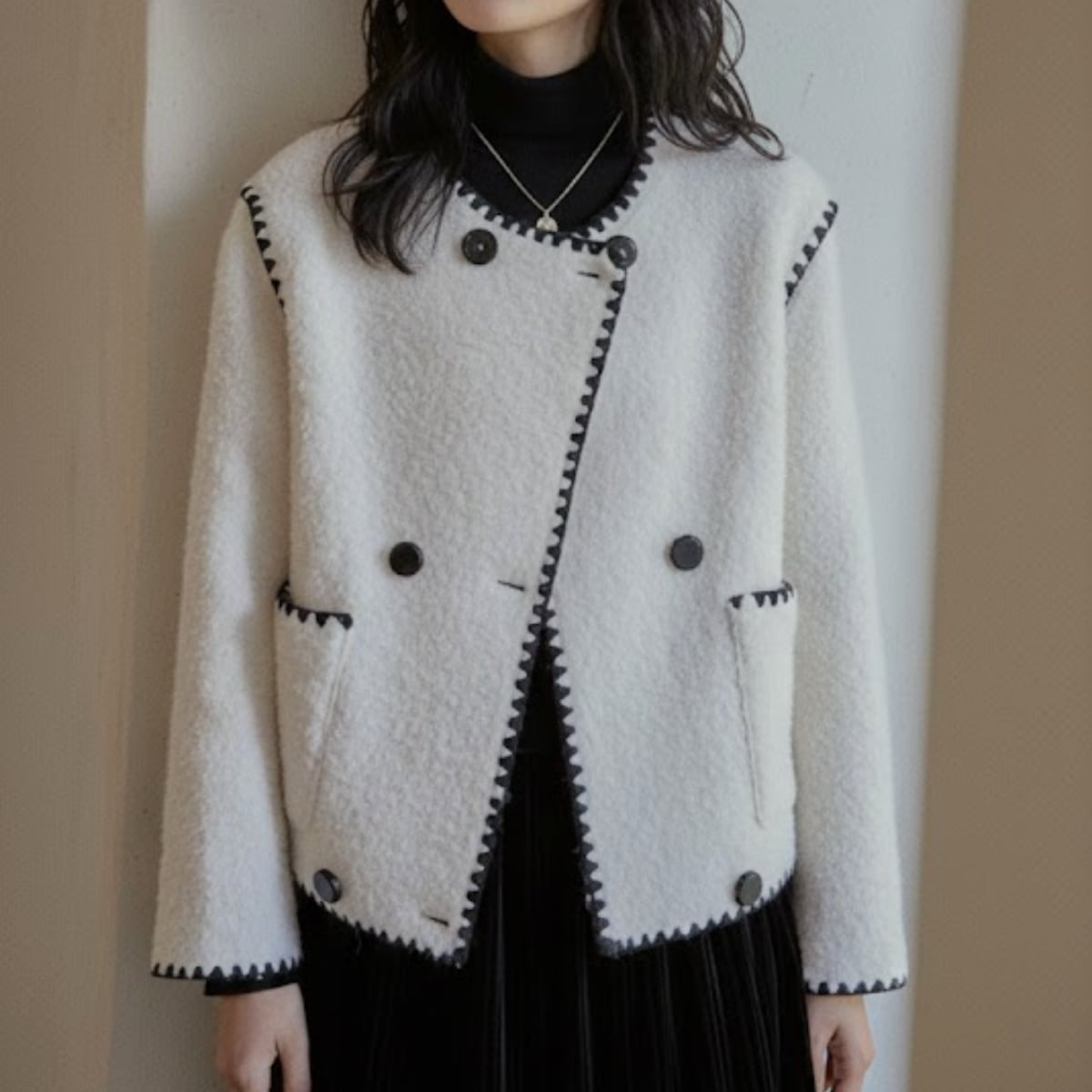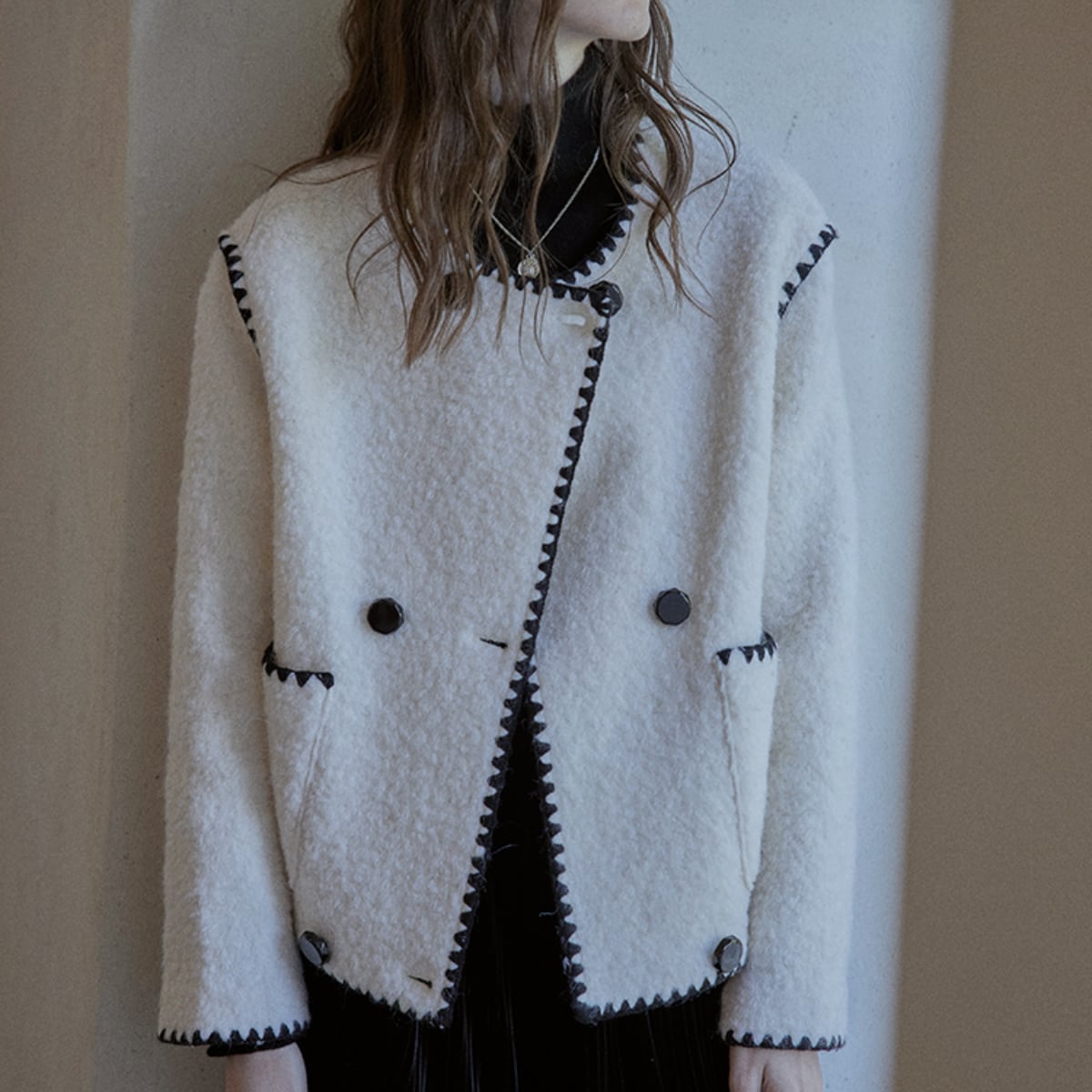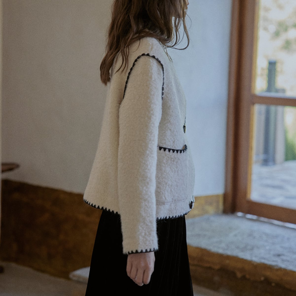 表情豊かなボア調の素材で、見た目にも暖かなショートジャケット。オフホワイトの身頃と、きりりとしたブラックの縁取りが織りなすバイカラーデザインが魅力です。