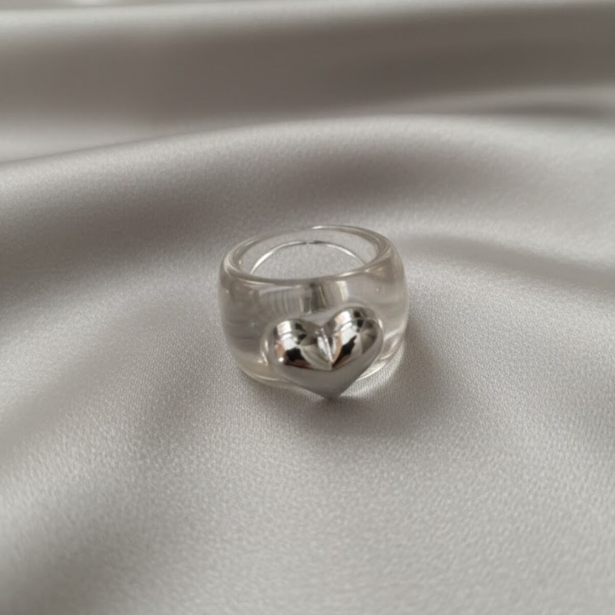 透明な樹脂の中に、立体的なハートがインレイされた、シンプルながらも存在感のあるクリアリングです。
