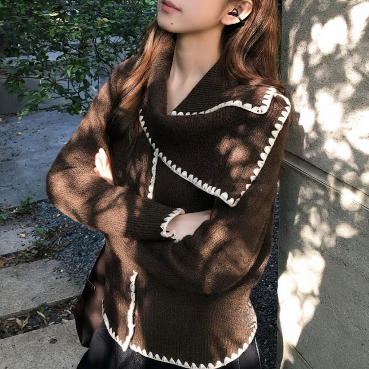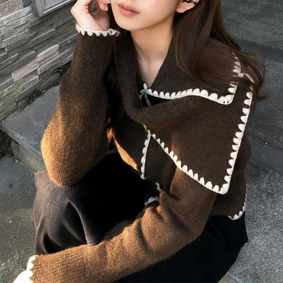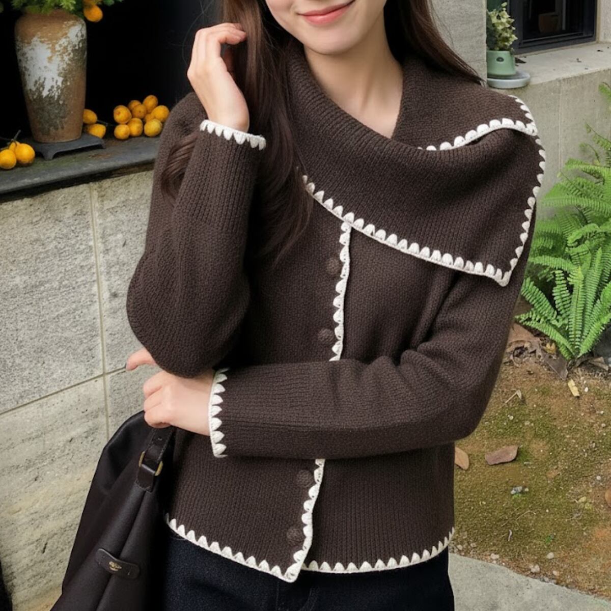 深みのあるショコラブラウンに、真っ白なブランケットステッチが映える、主役級のニットカーディガンが登場しました。