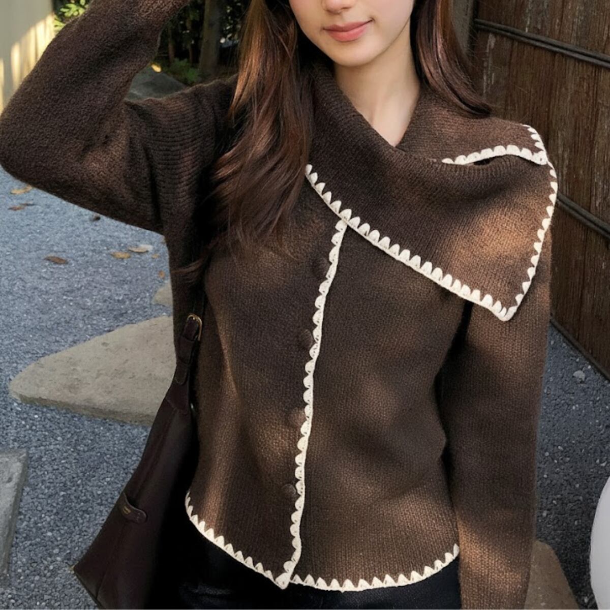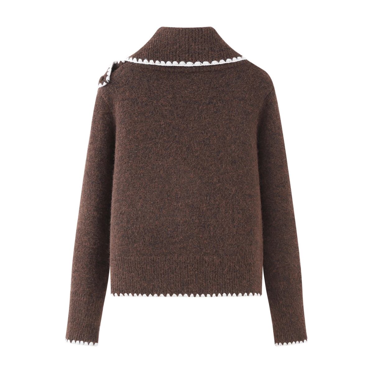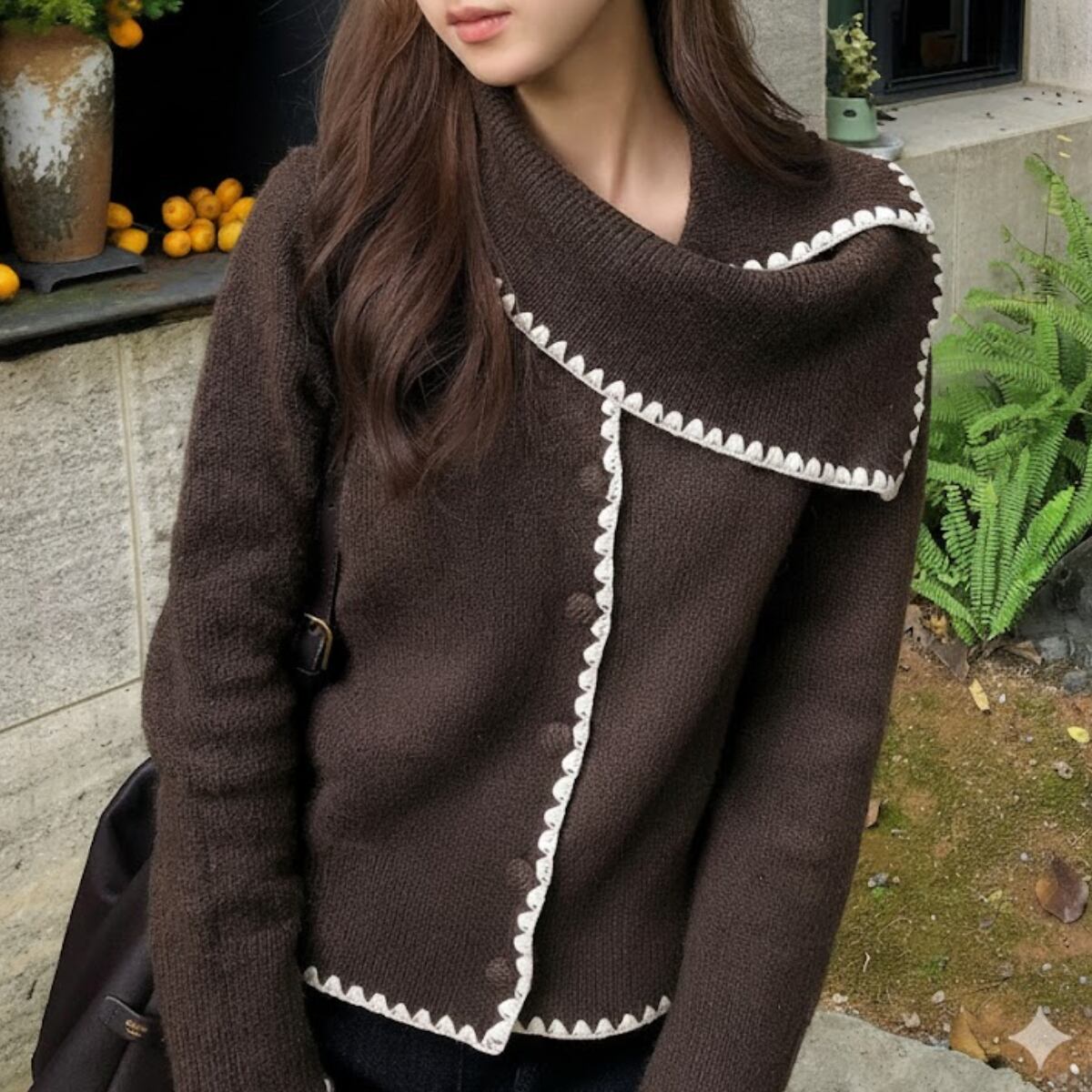 深みのあるショコラブラウンに、真っ白なブランケットステッチが映える、主役級のニットカーディガンが登場しました。