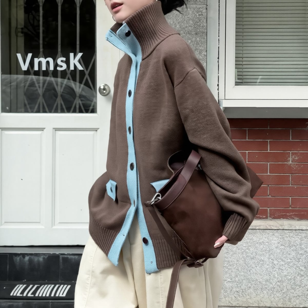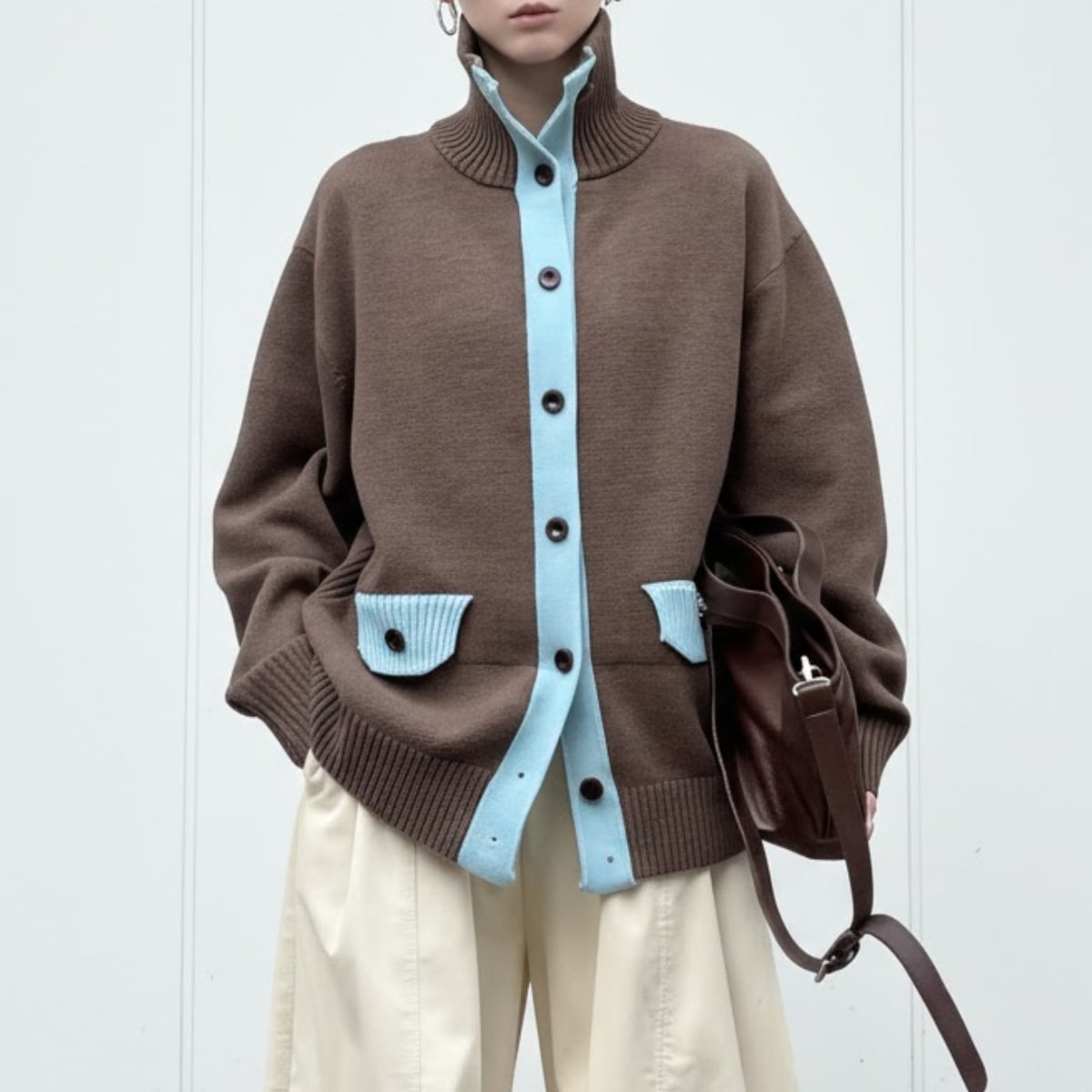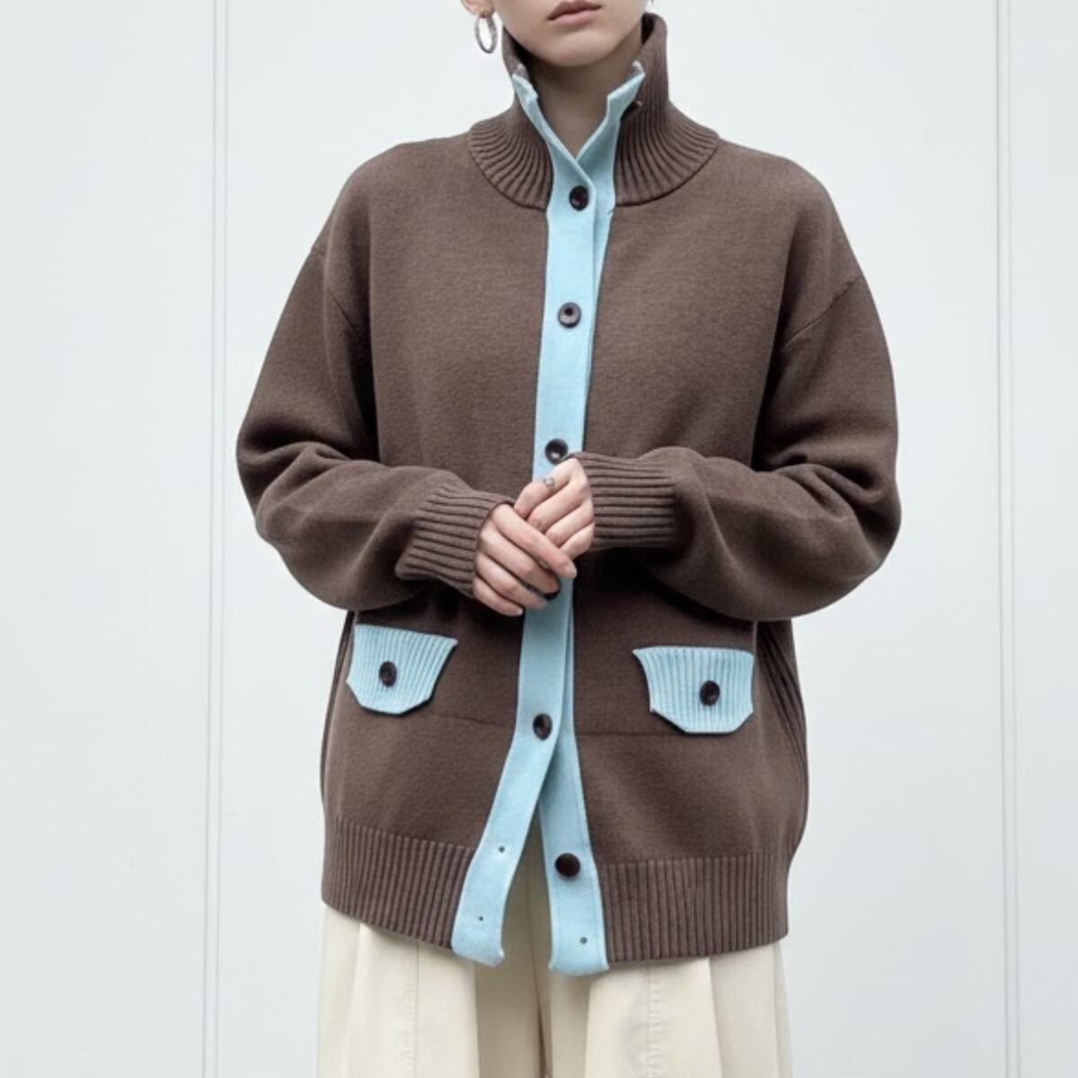ベースとなるのは、深みのあるエスプレッソブラウン。ボタンの開閉によって、タートルネックのような知的な表情から、襟を寝かせたリラックスしたスタイルまで、その日の気分に合わせた着こなしが楽しめます。
