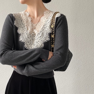 デコルテを縁取る繊細なスカラップレースが華やかさを演出する主役級のニットプルオーバーです。
