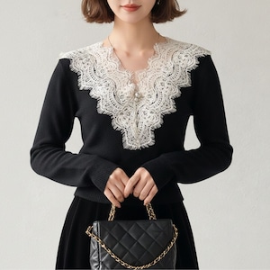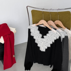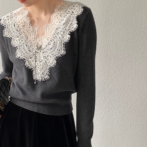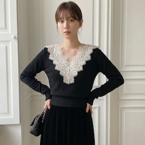 Lace-Trimmed Scalloped V-Neck Knit ch0369