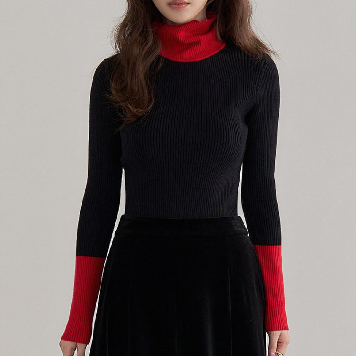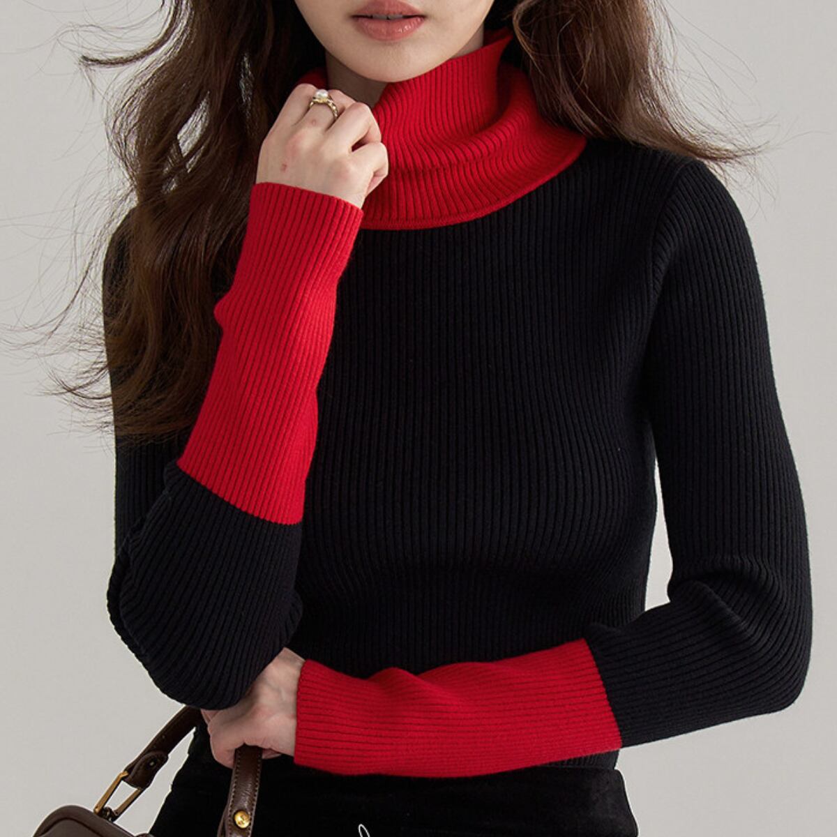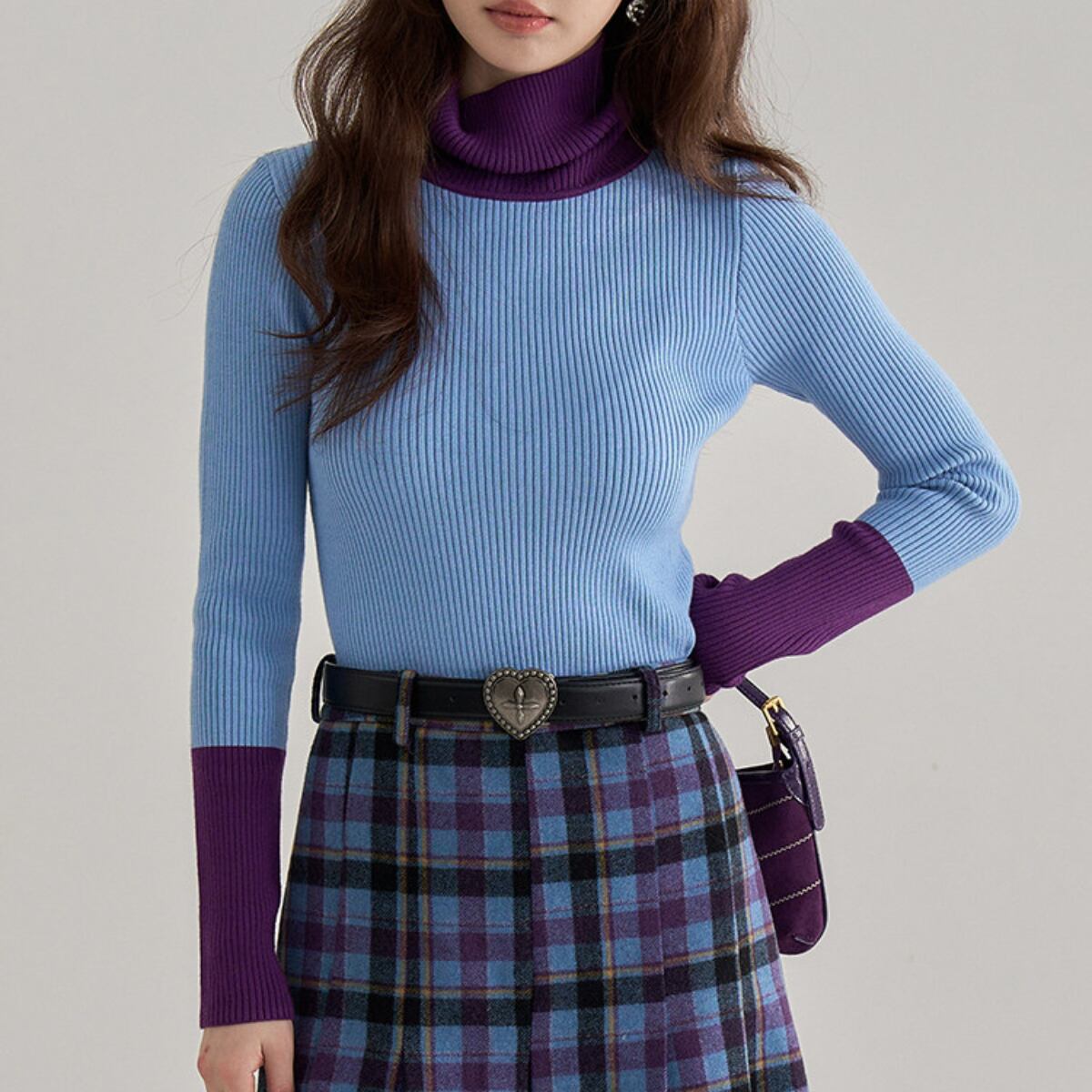 Bicolor Turtleneck Ribbed Knit Top ch0404