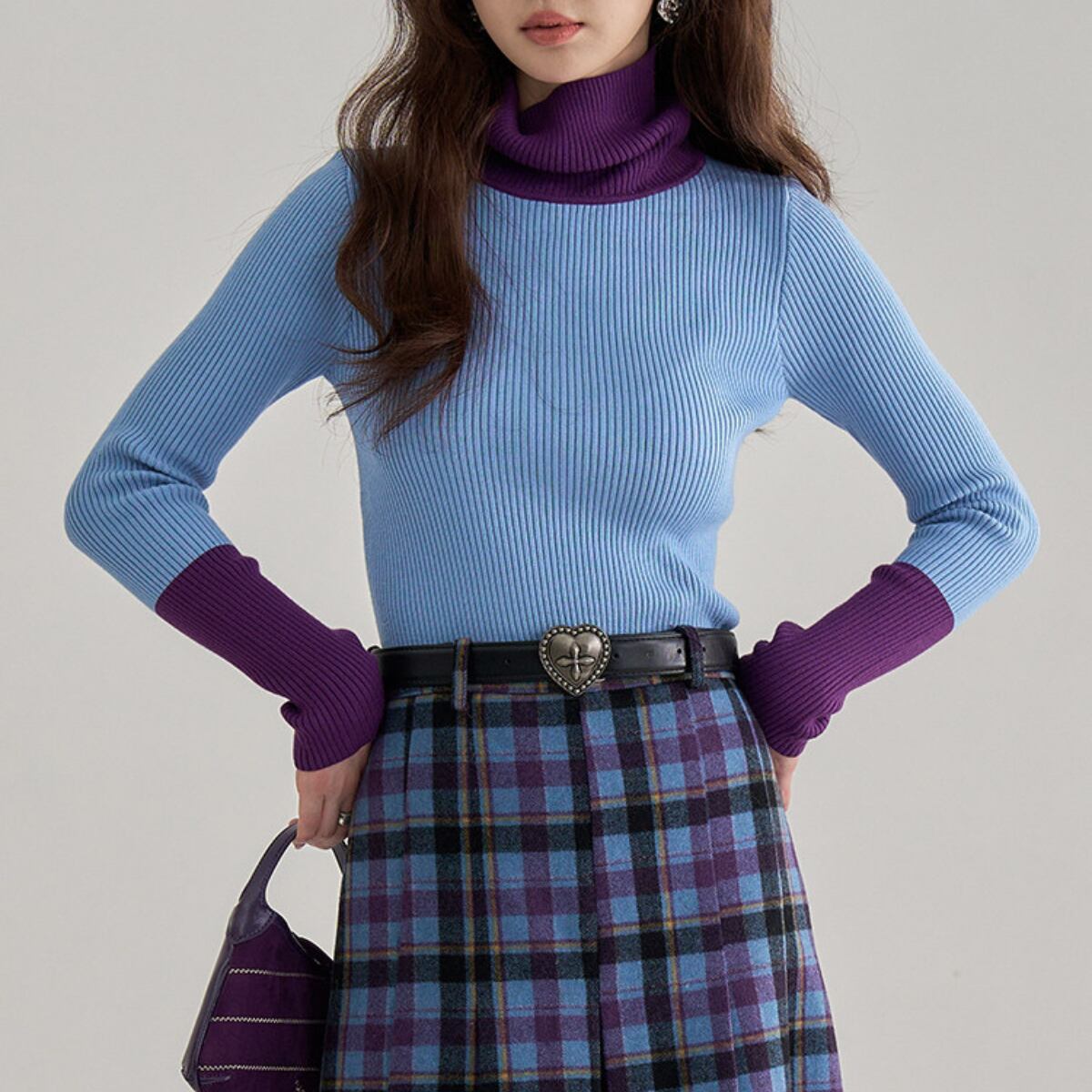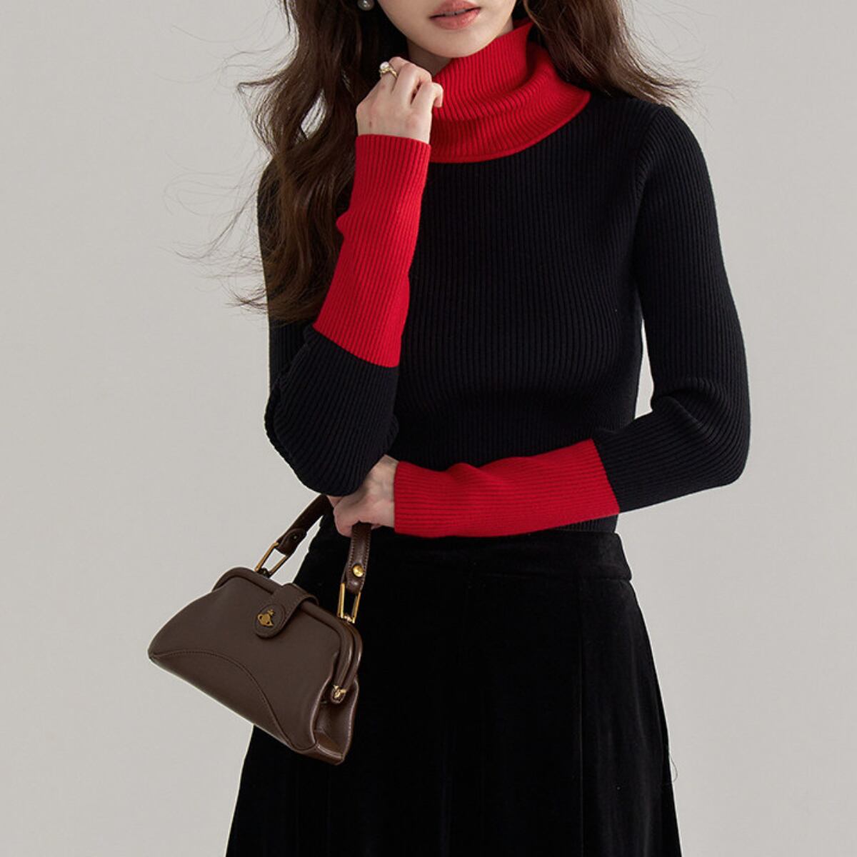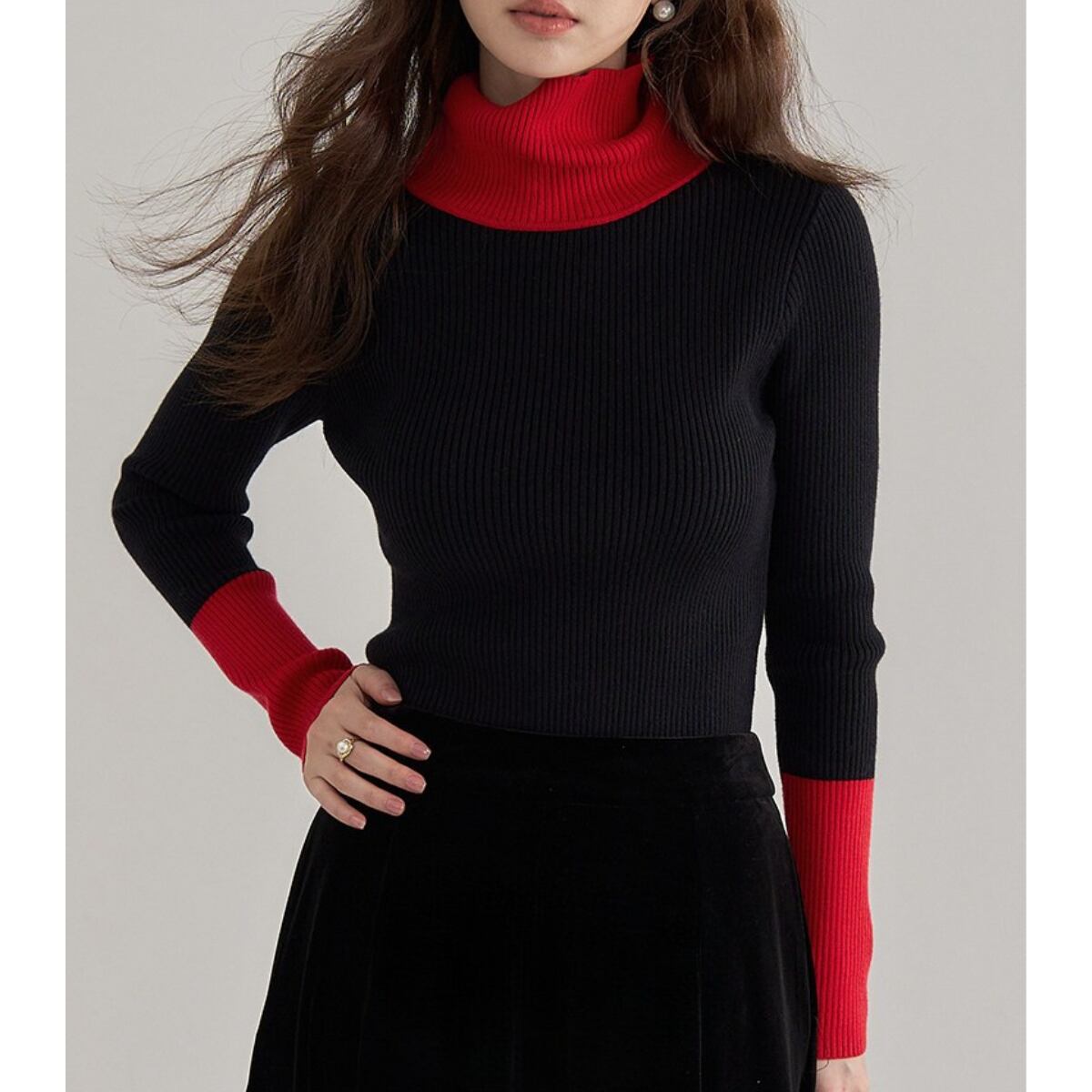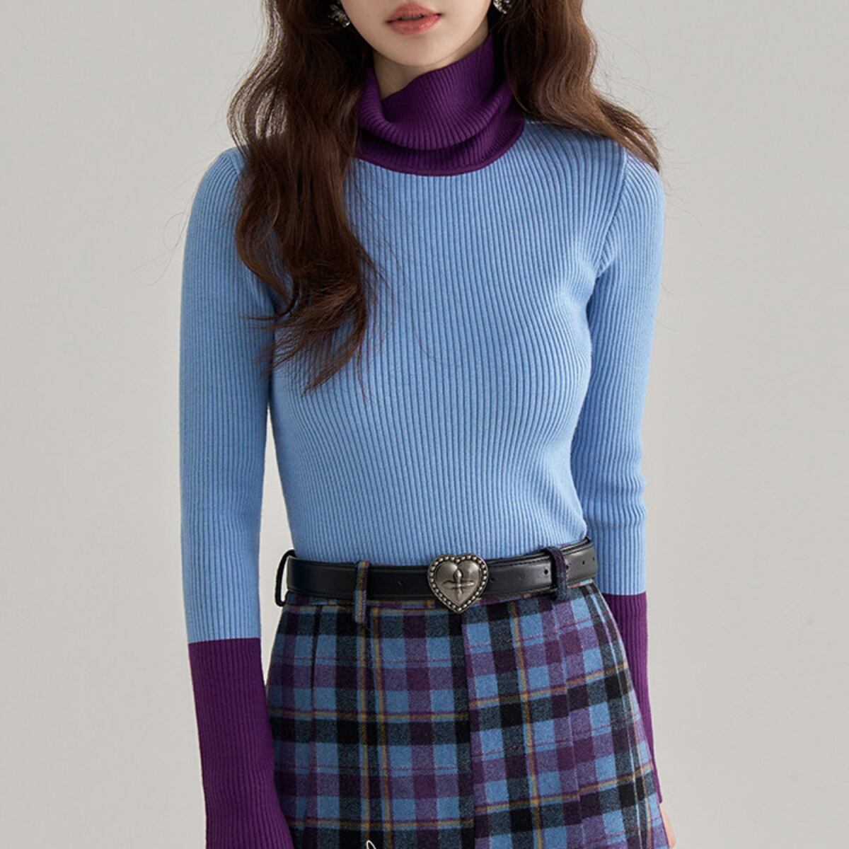 Bicolor Turtleneck Ribbed Knit Top ch0404