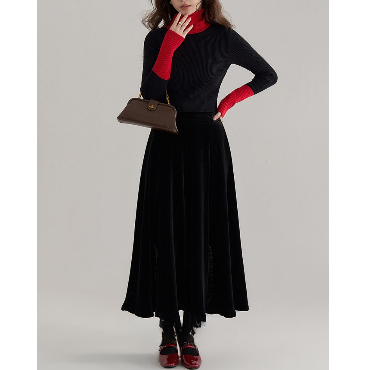 体に優しくフィットするタイトなシルエットながら、縦のラインを強調するリブ編みが上半身をすっきりと細見えさせてくれます。首元を温かく包み込むタートルネックは、折り返しても、そのままラフにクシュッとさせてもこなれた印象に。