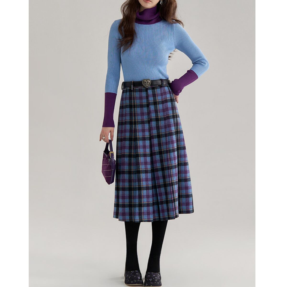 深みのあるパープルと鮮やかなスカイブルーを織り交ぜた、幻想的なカラーリングのタータンチェックが目を引くスタートです。