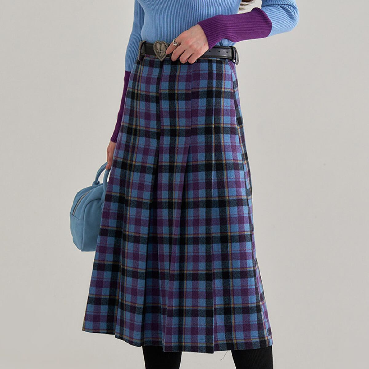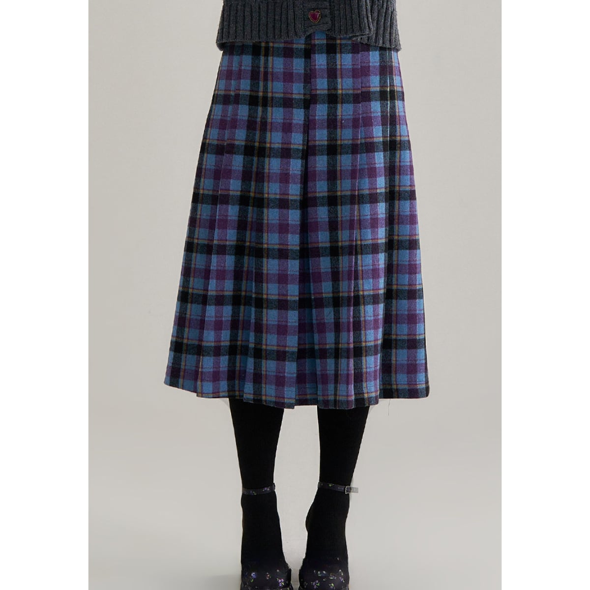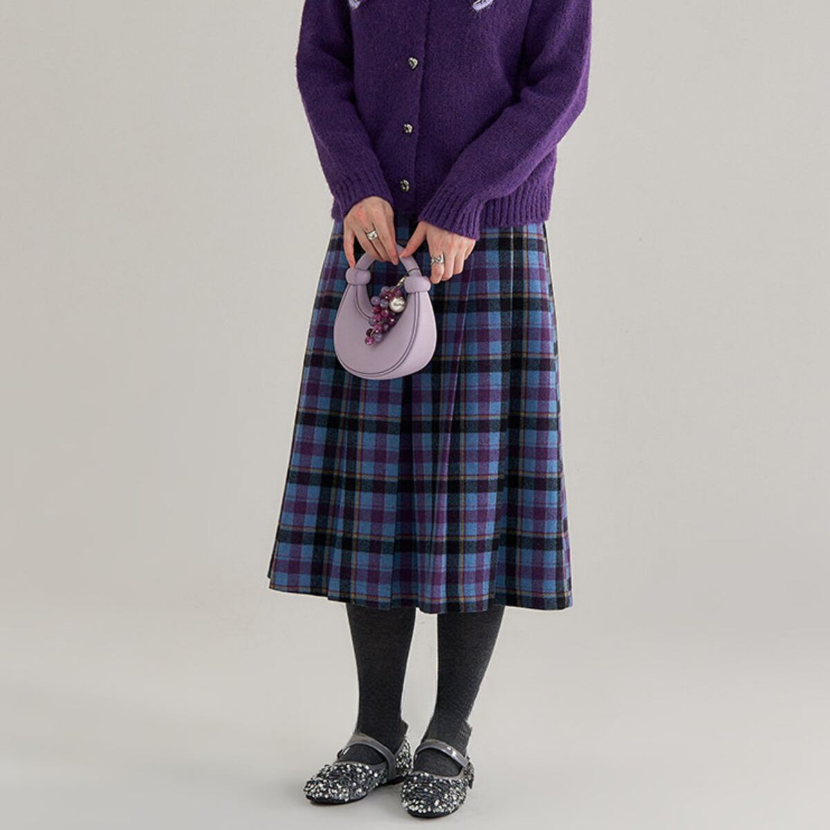 深みのあるパープルと鮮やかなスカイブルーを織り交ぜた、幻想的なカラーリングのタータンチェックが目を引く一着です。