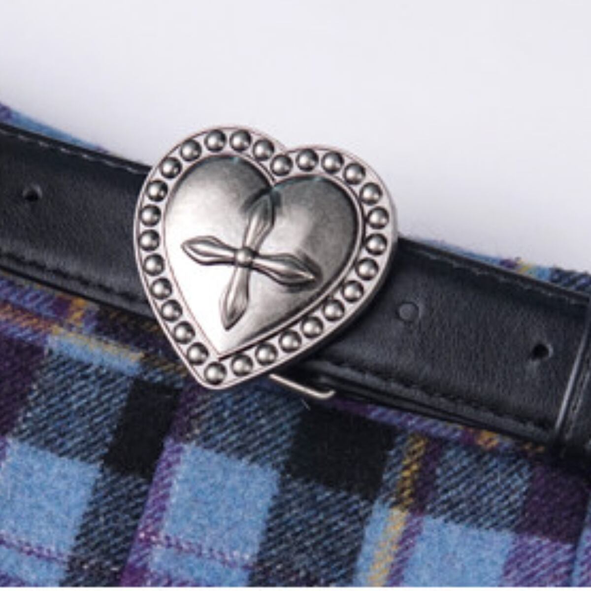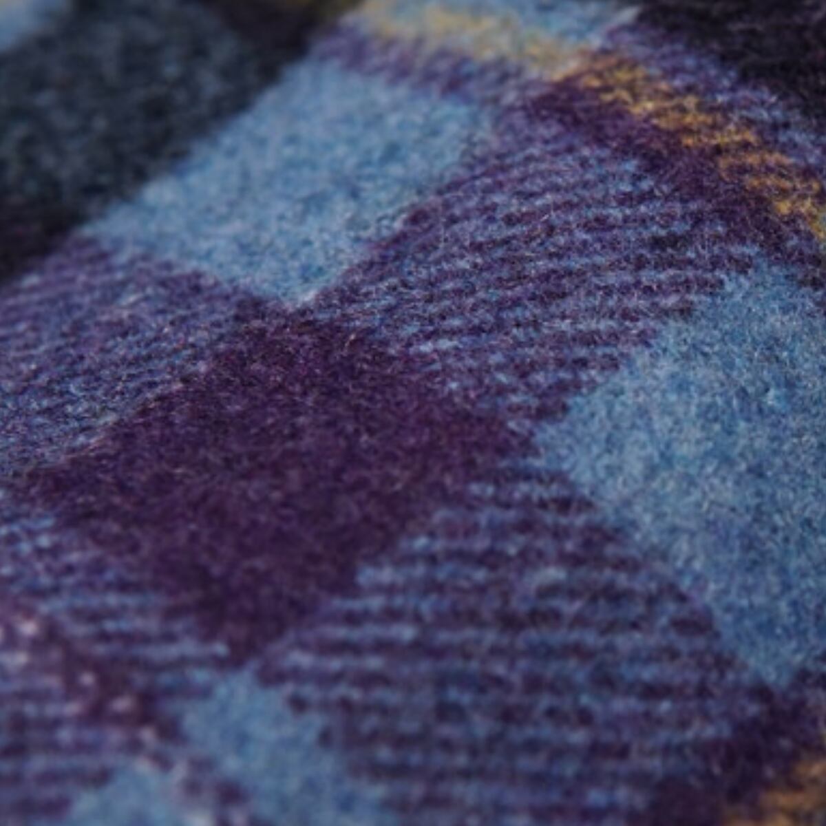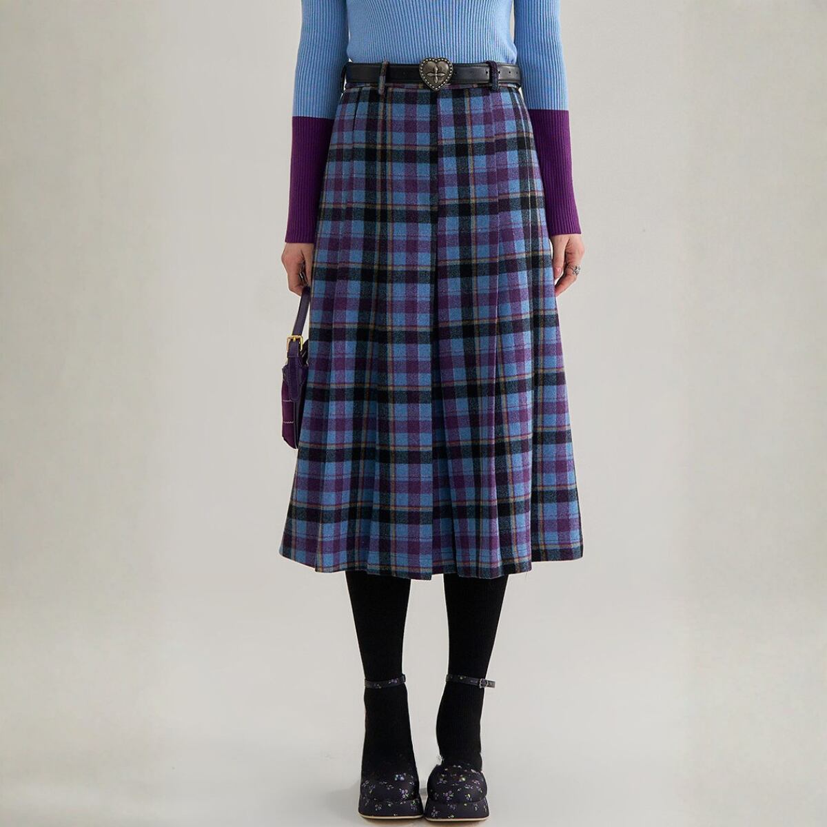深みのあるパープルと鮮やかなスカイブルーを織り交ぜた、幻想的なカラーリングのタータンチェックが目を引く一着です。
