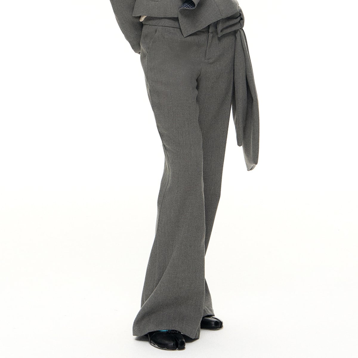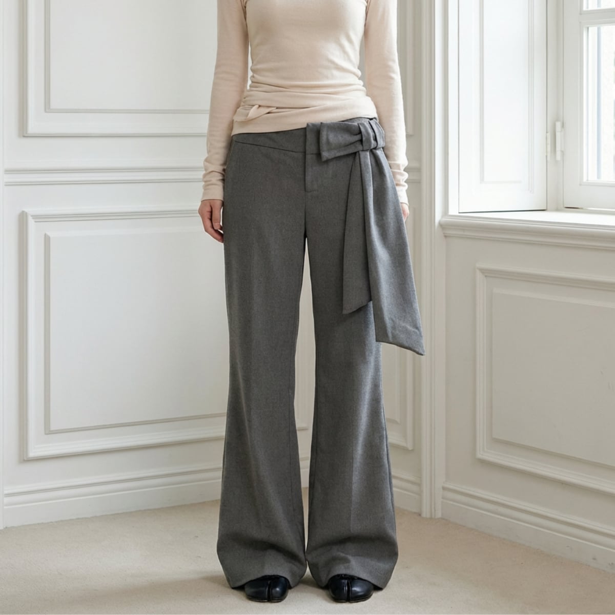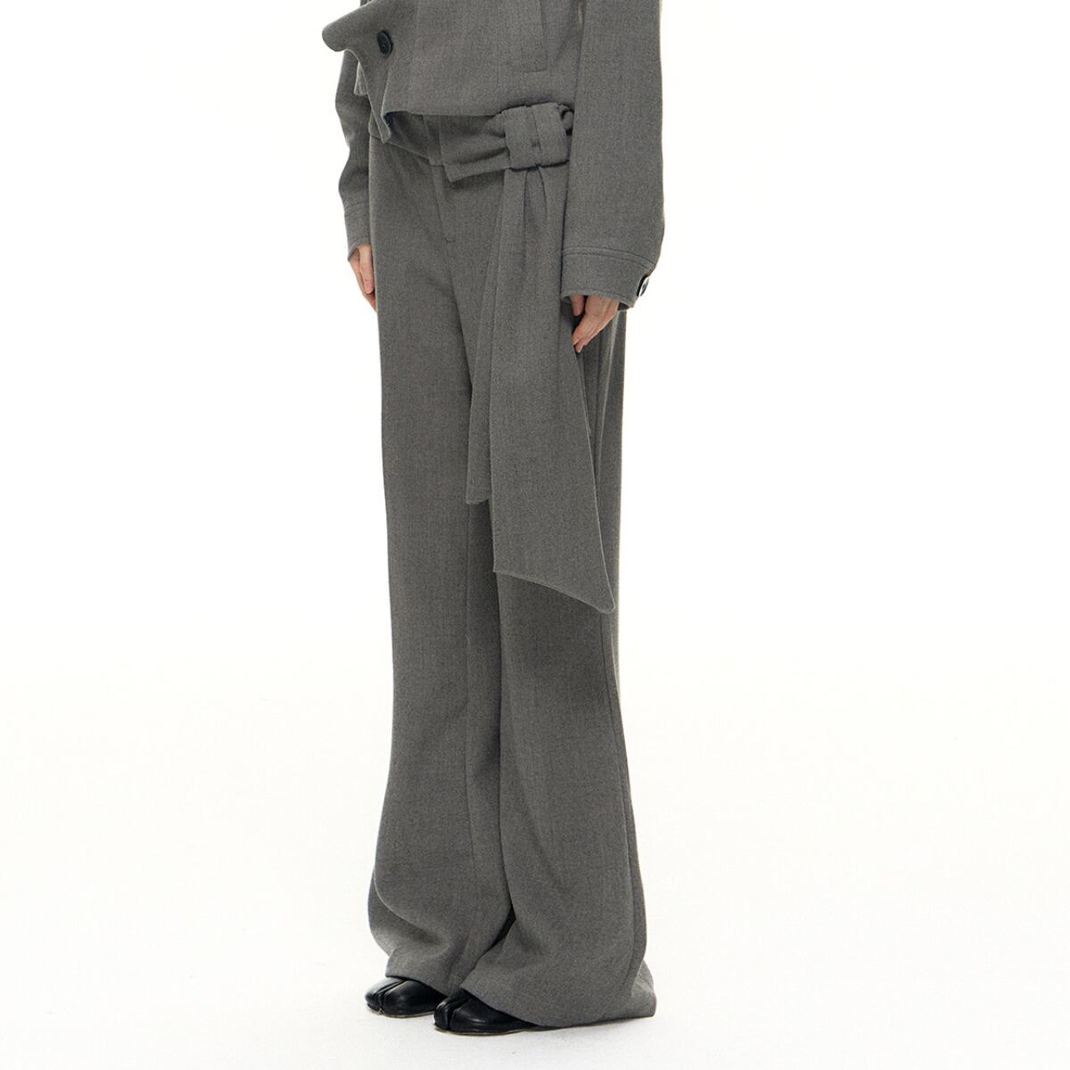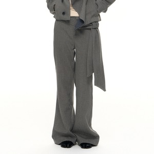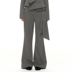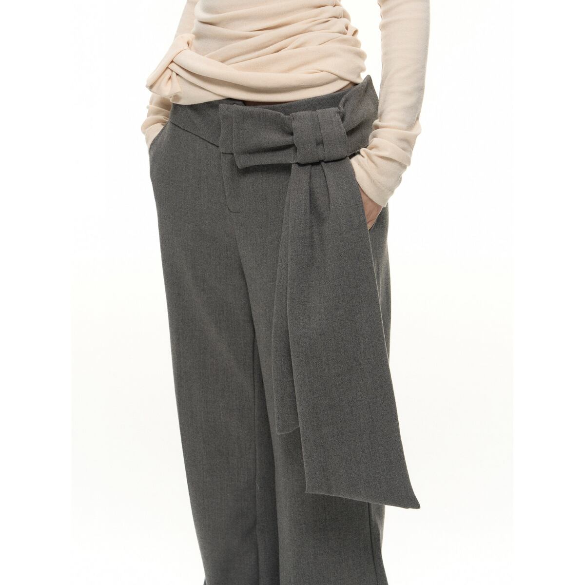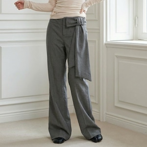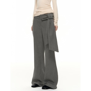 一見シンプルなグレーのワイドパンツに、共布の大きなタイ(リボン)デザインをプラスした、エッジの効いた一着です。
