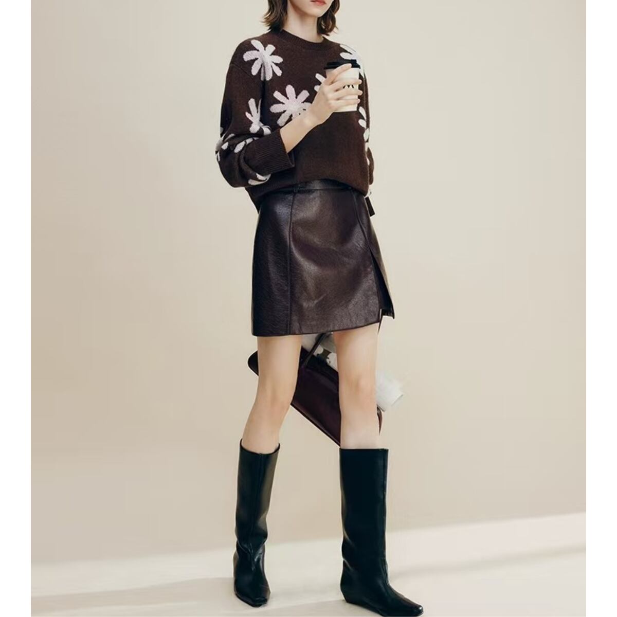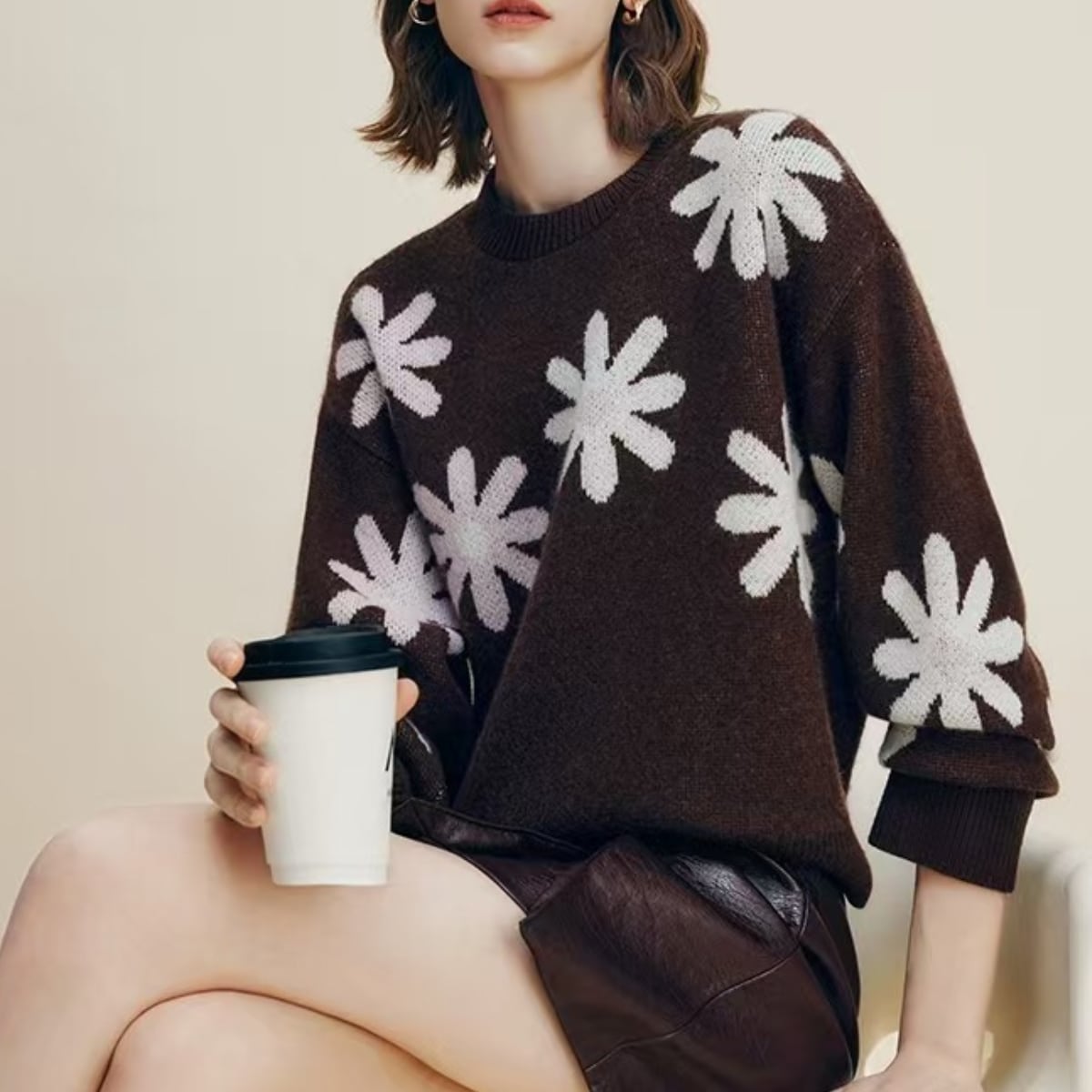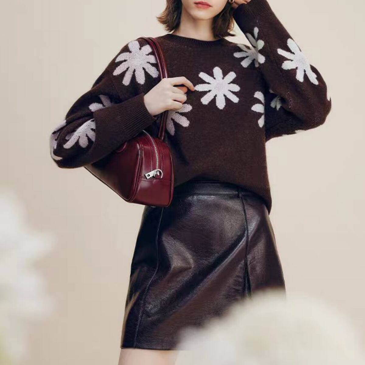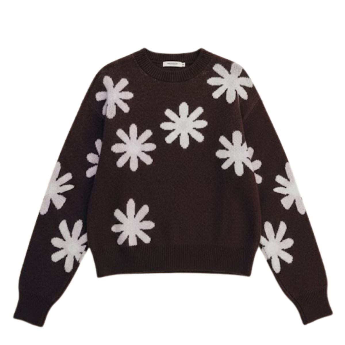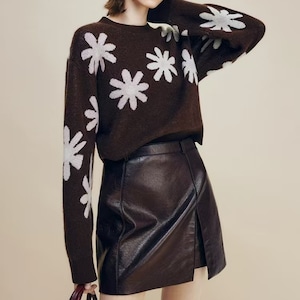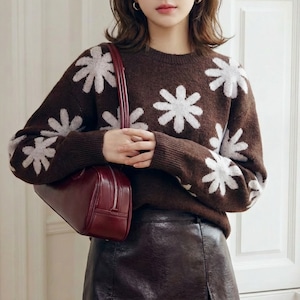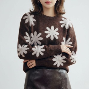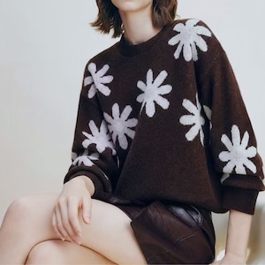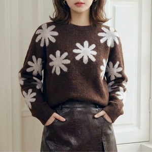 落ち着きのある深いコーヒーブラウンのボディに、手描きのような温かみのあるビッグフラワー柄を大胆に散りばめたジャガードニットです。