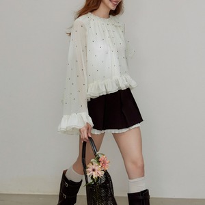 繊細な透け感のあるシフォン生地に、控えめなポルカドットを散りばめた、エレガントかつモダンなブラウスです。