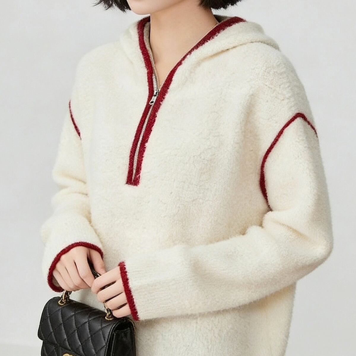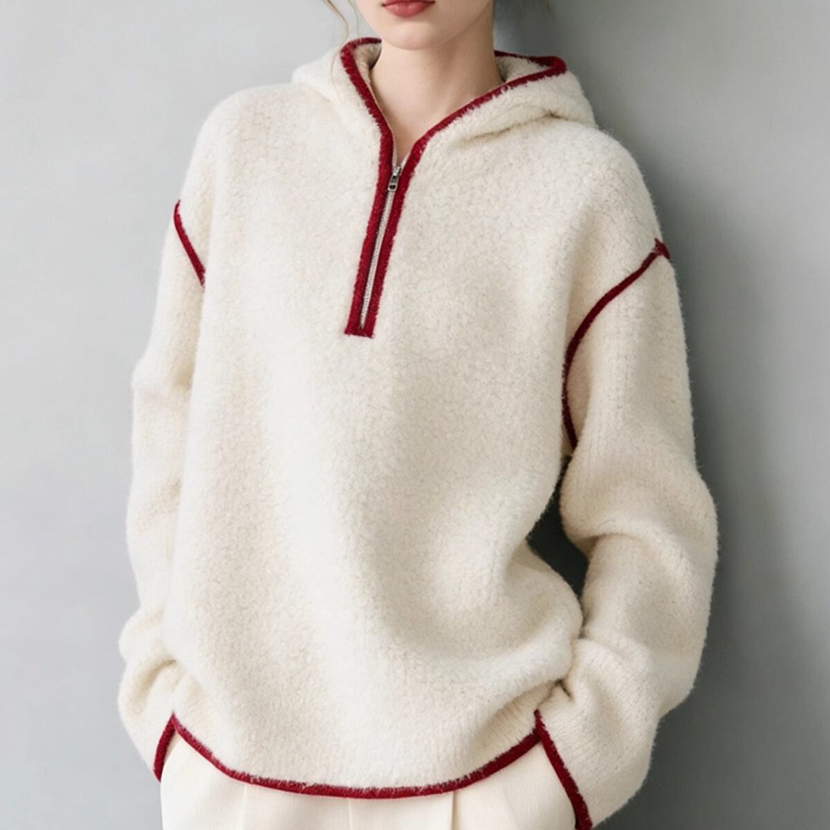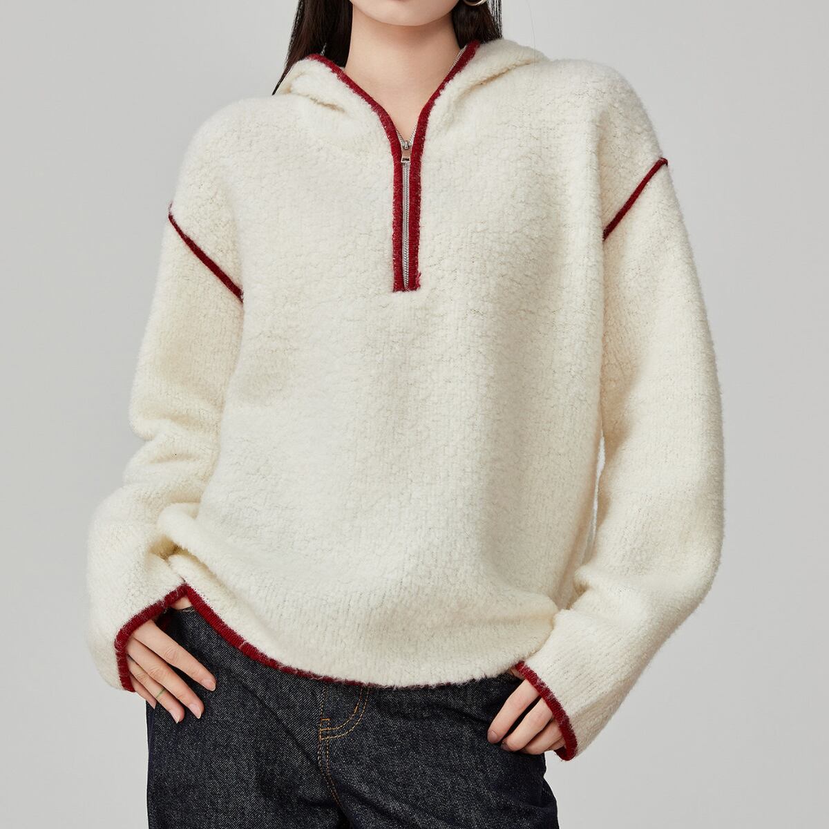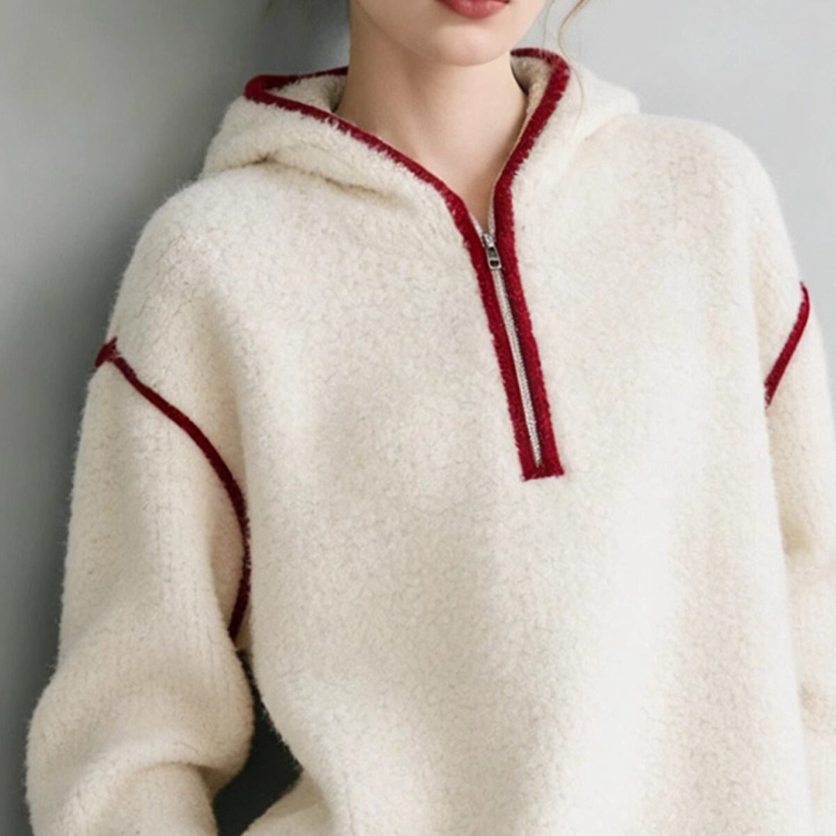 ふんわりと柔らかな質感のボアフリース素材を使用した、ハーフジップ仕様のフーディートップスです。