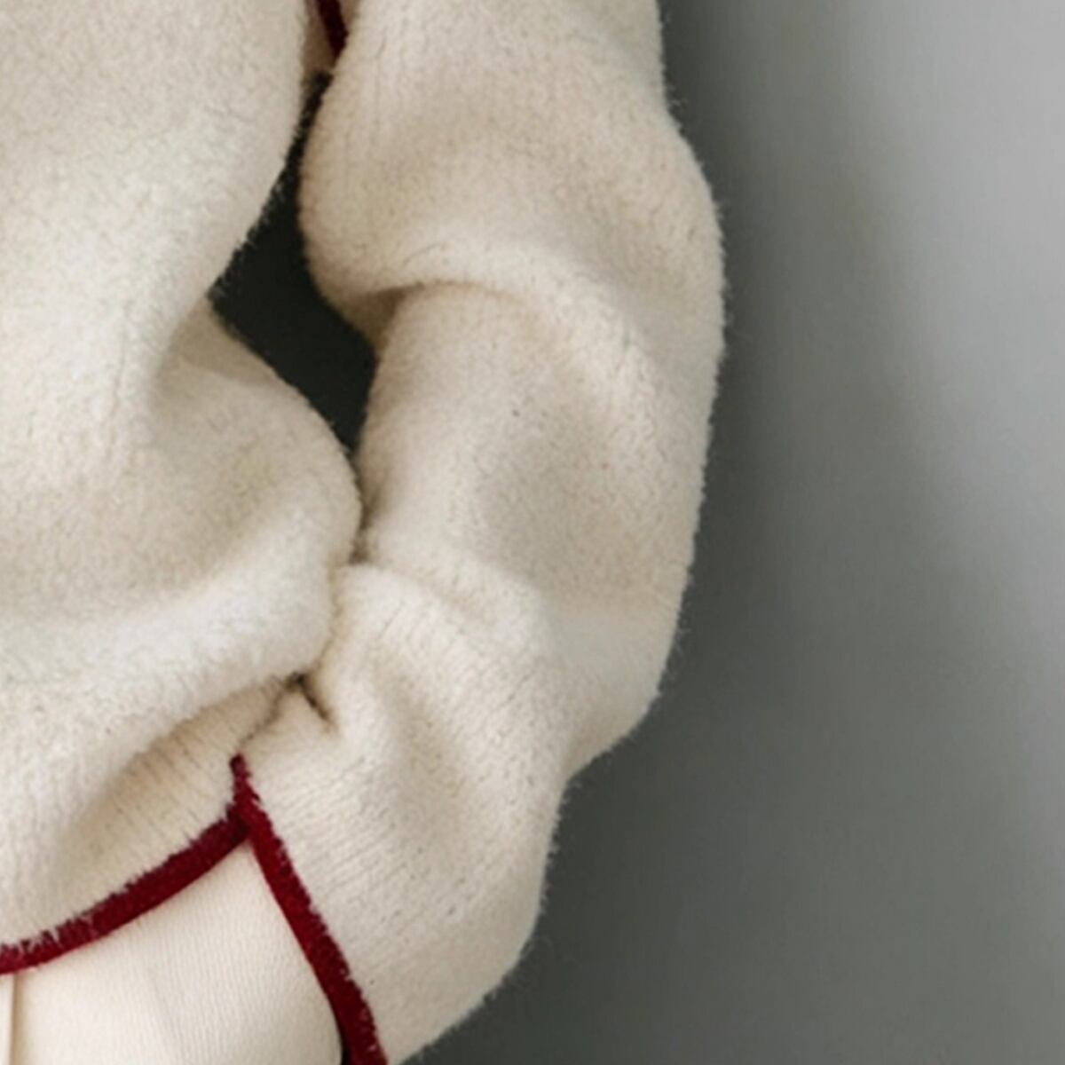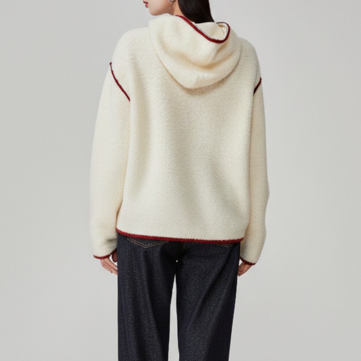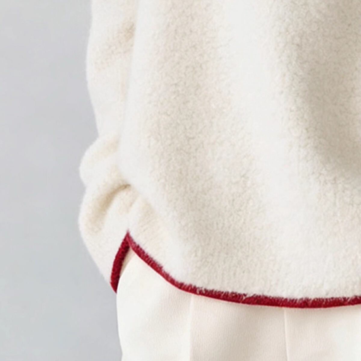 最大のポイントは、首元から裾、袖口にかけて施されたコントラストカラーのパイピング。クリーンなアイボリーに映える鮮やかなレッドが、全体を引き締め、モダンで洗練された印象を与えます。