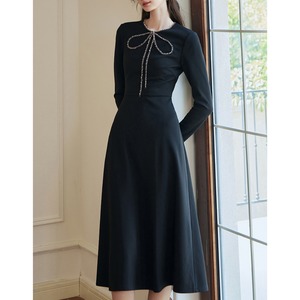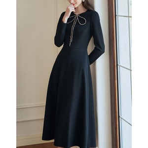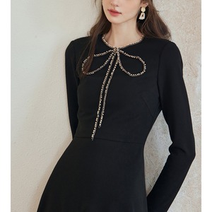シックなブラックの生地に、繊細なパールチェーンで描かれた大きなリボンが目を引く、主役級のワンピースです。アクセサリー要らずで華やぐデザインは、まさに「高見え」を叶える特別な一着。