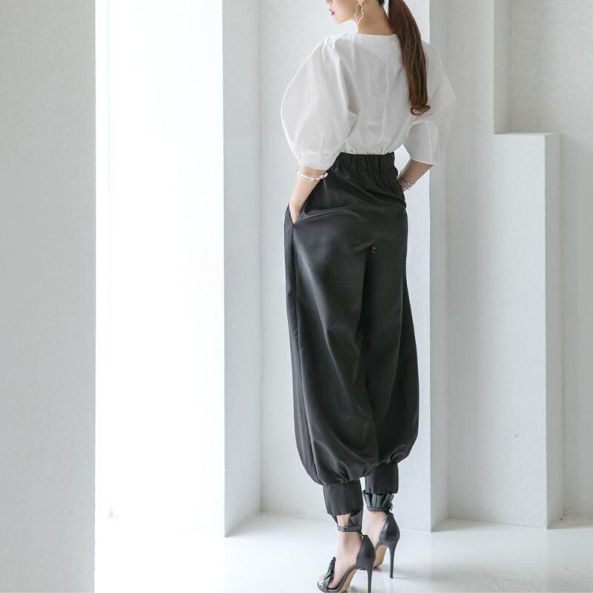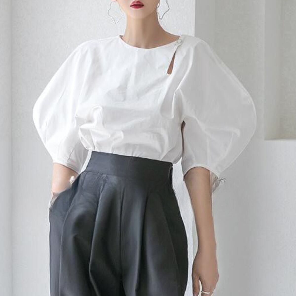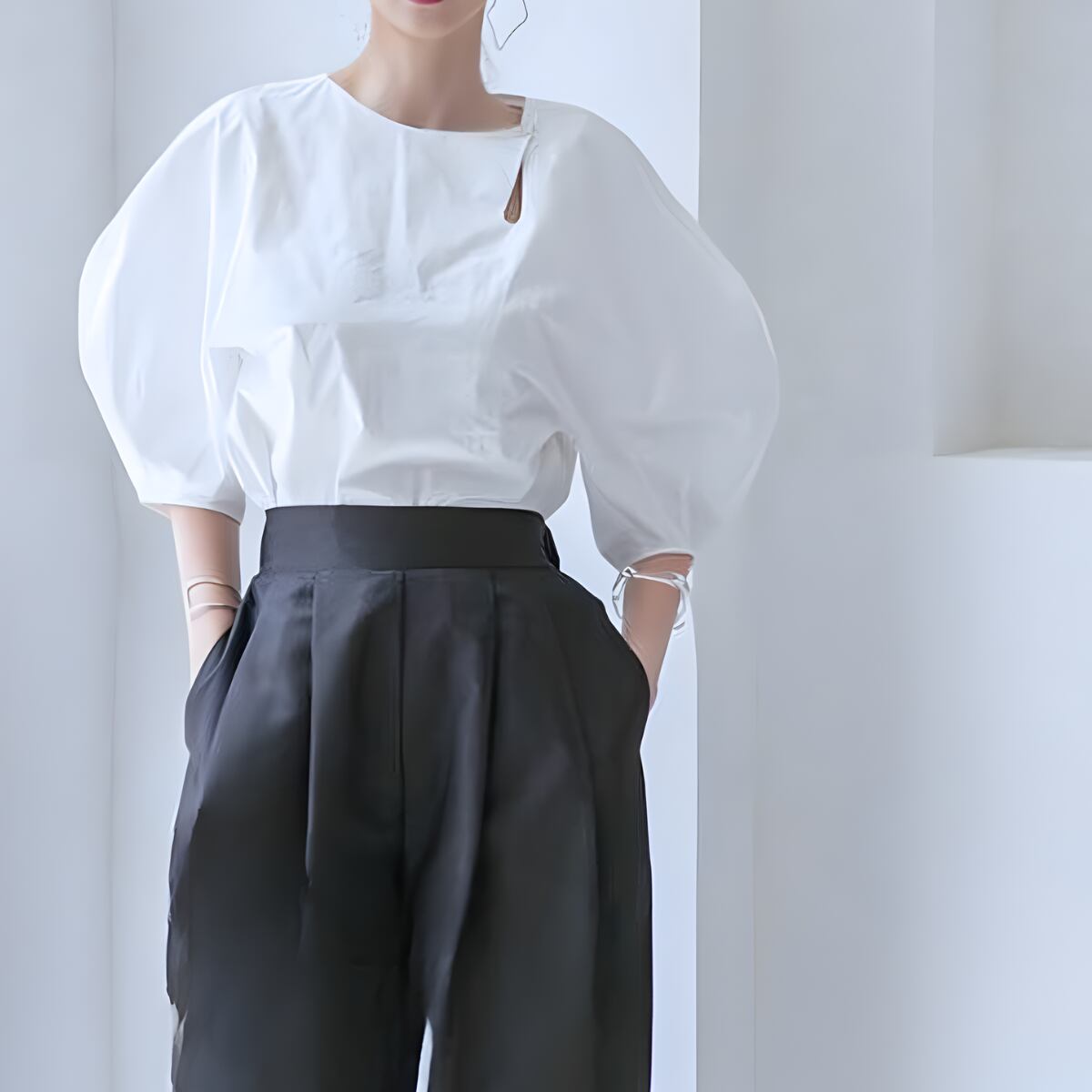 目を惹くのは、空気をたっぷりと含んだような立体的なパフスリーブ。肩から袖口にかけてのボリューム感が、華奢見えを演出しつつ、シンプルながらも圧倒的な存在感を放ちます。