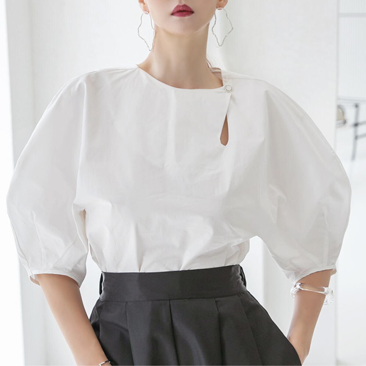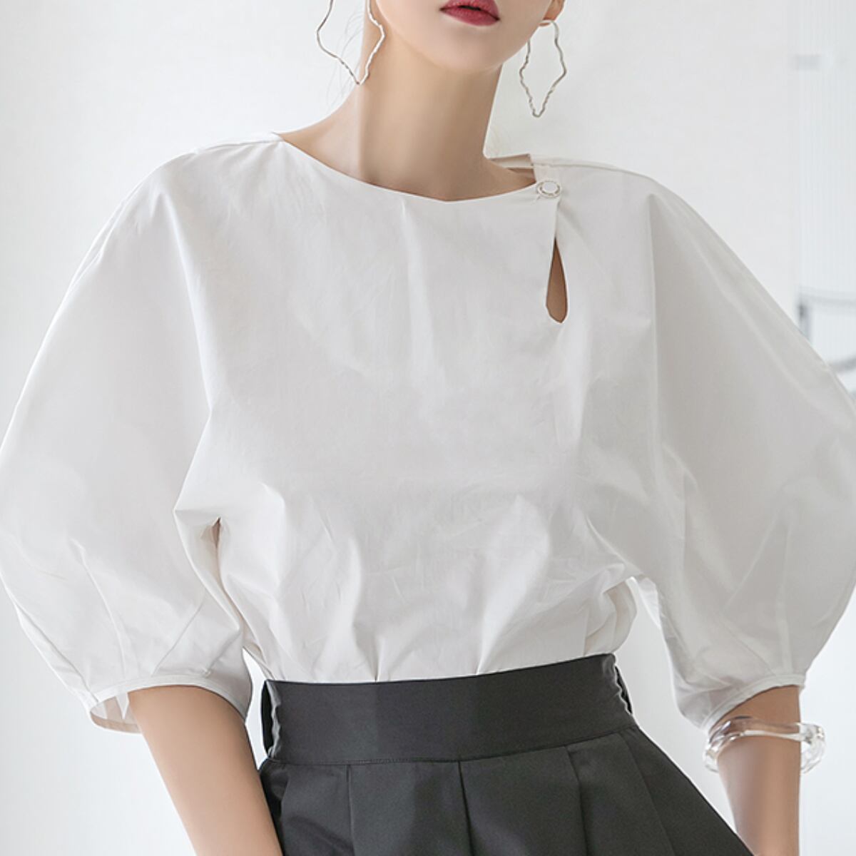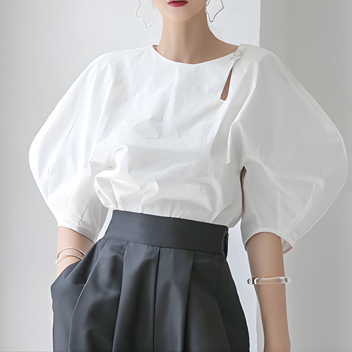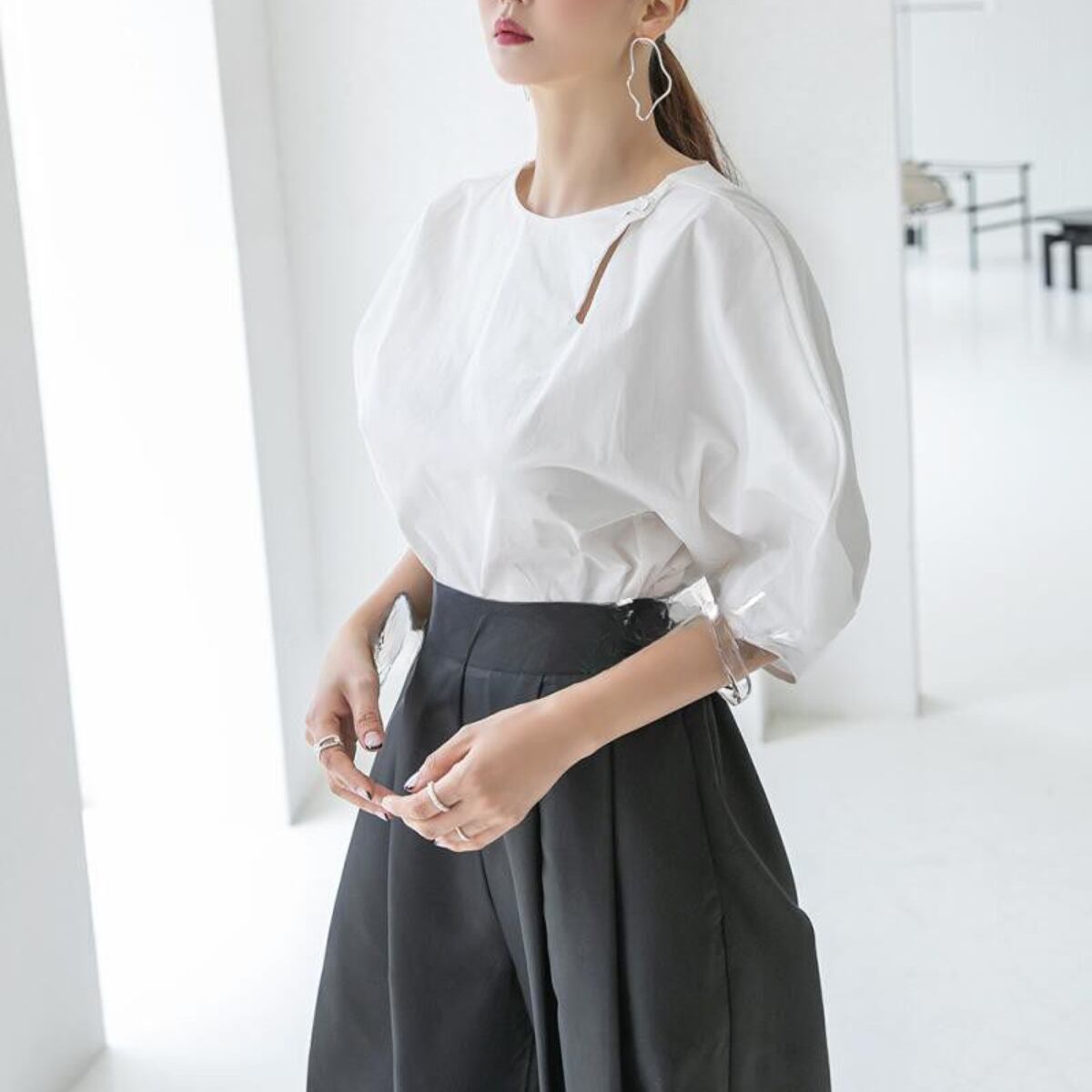 目を惹くのは、空気をたっぷりと含んだような立体的なパフスリーブ。肩から袖口にかけてのボリューム感が、華奢見えを演出しつつ、シンプルながらも圧倒的な存在感を放ちます。