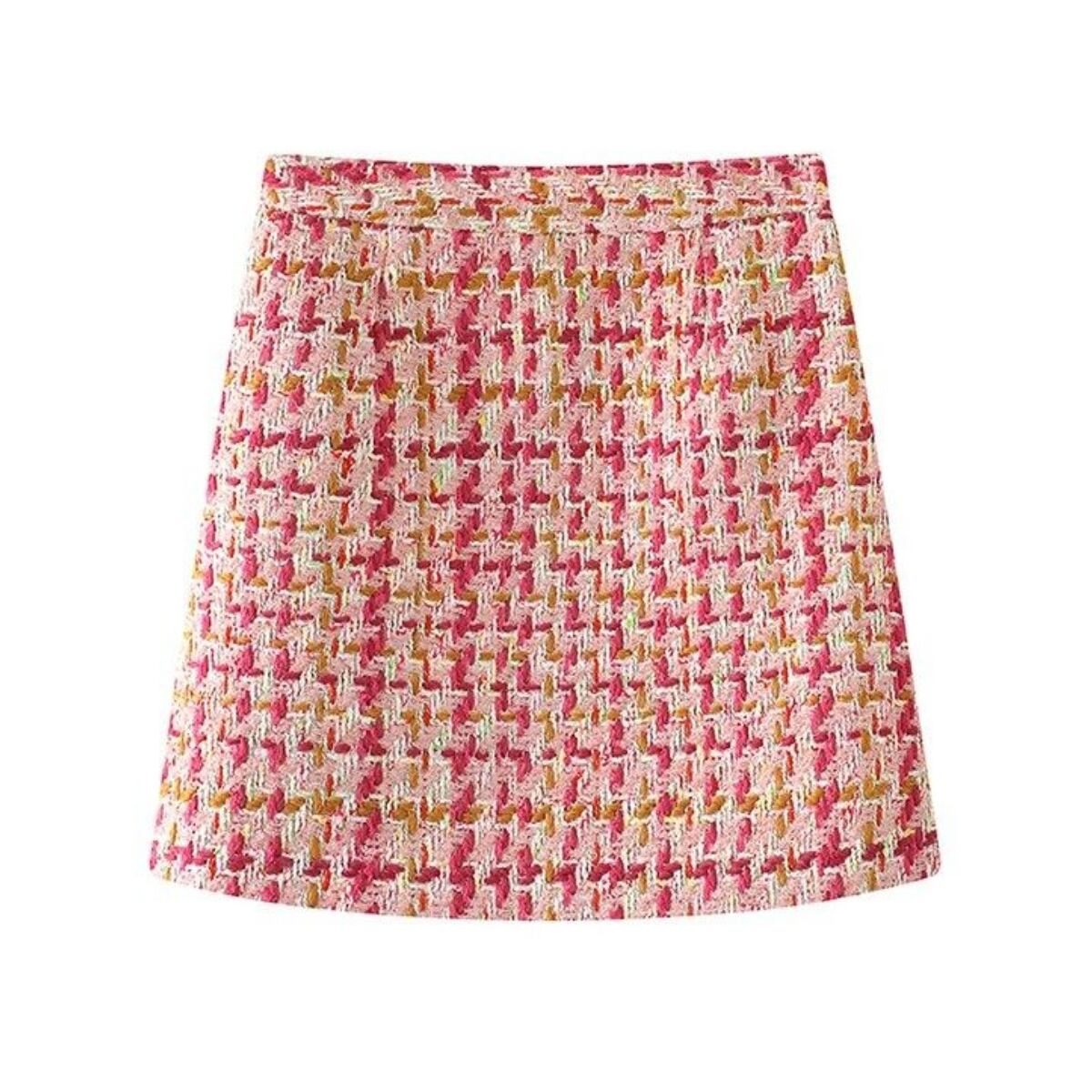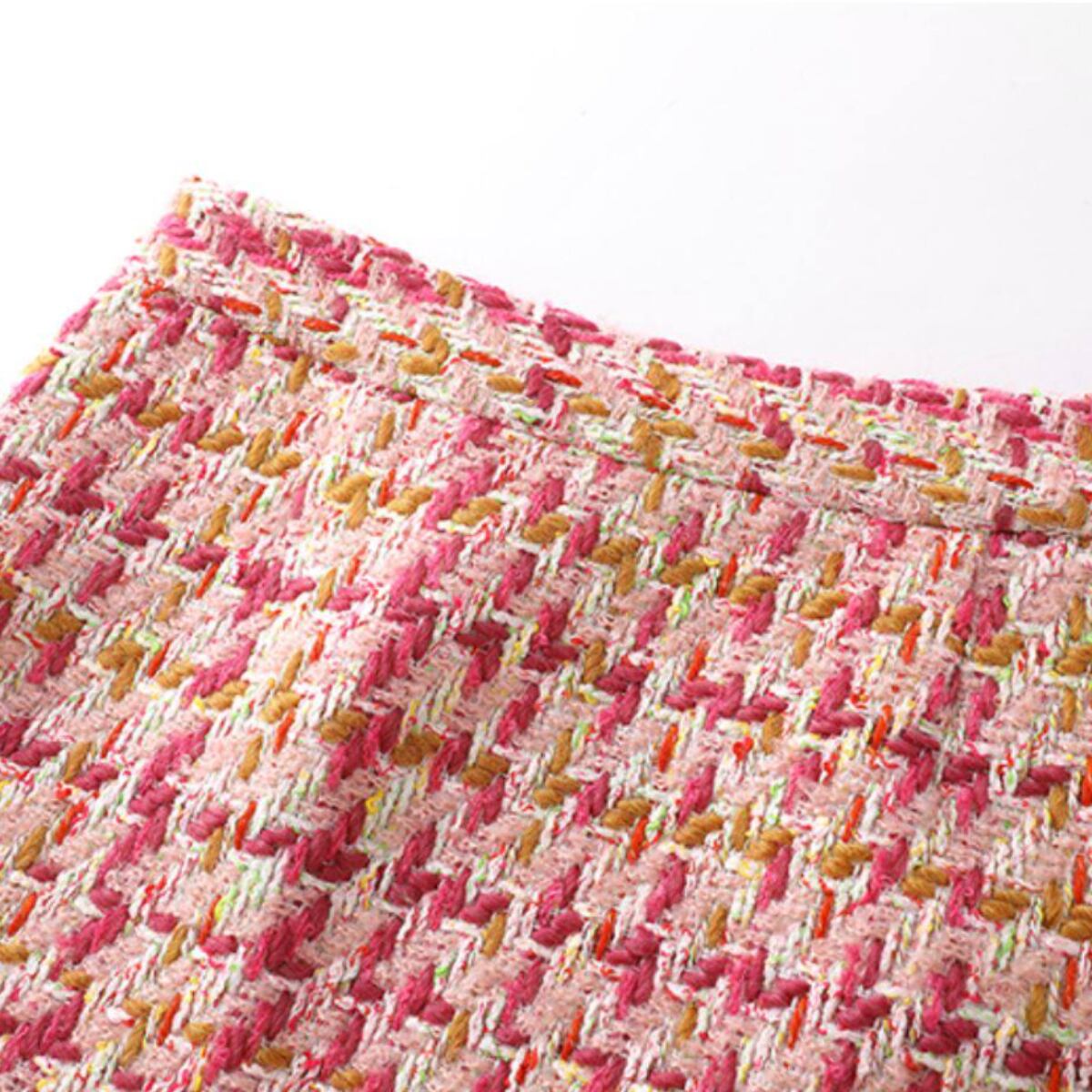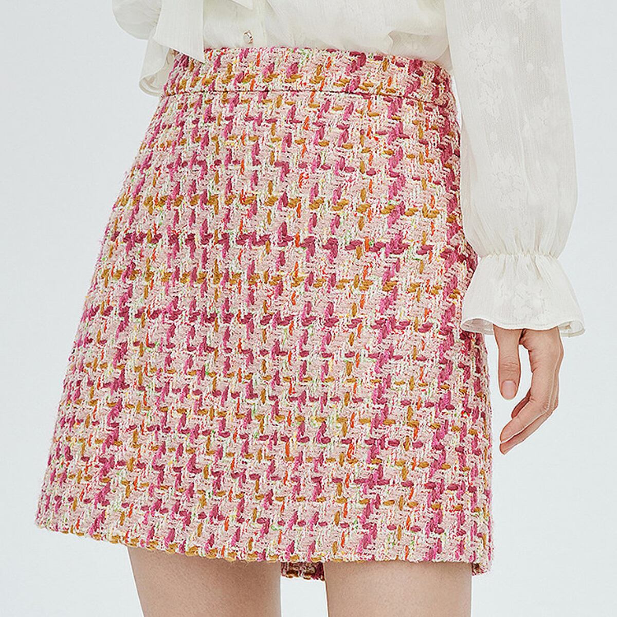 華やかなピンクを基調に、アイボリーやイエローを織り交ぜたツイード素材が目を惹く台形ミニスカート。表情豊かな織り生地がコーディネートに上品な華やかさをプラスし、春夏シーズンにぴったりの軽やかな印象を演出します。
