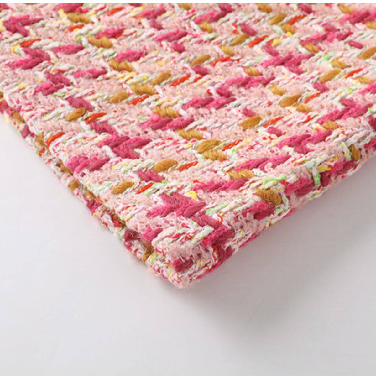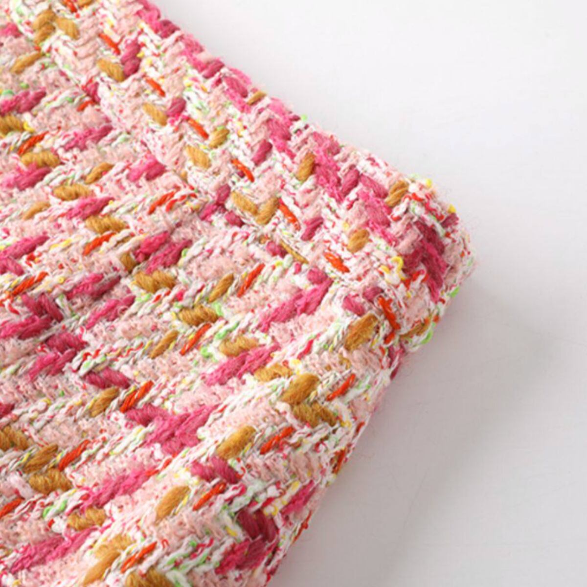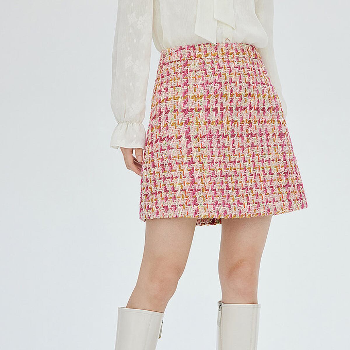 華やかなピンクを基調に、アイボリーやイエローを織り交ぜたツイード素材が目を惹く台形ミニスカート。表情豊かな織り生地がコーディネートに上品な華やかさをプラスし、春夏シーズンにぴったりの軽やかな印象を演出します。