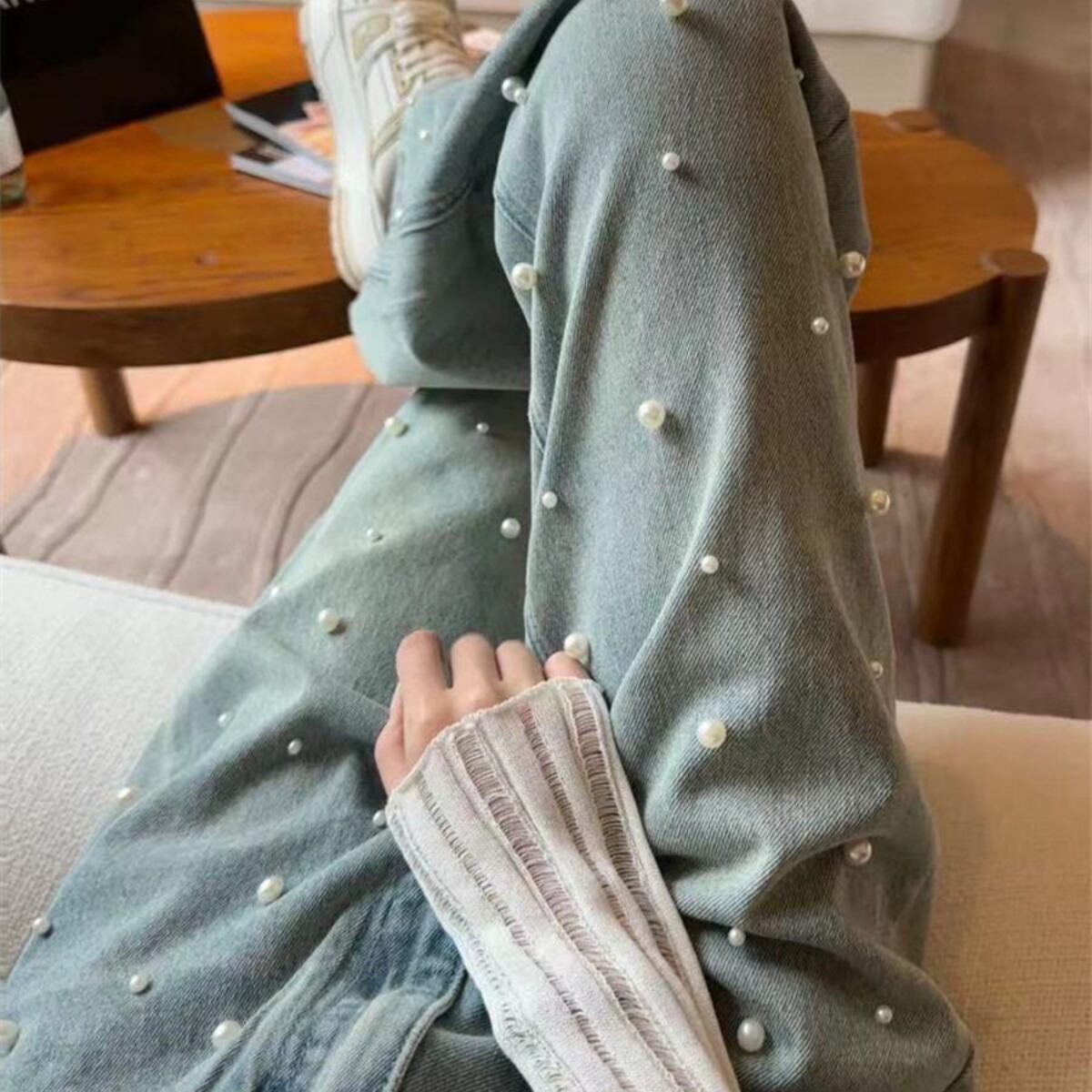 散りばめられたパールが目を惹く、華やかなデニムパンツ。