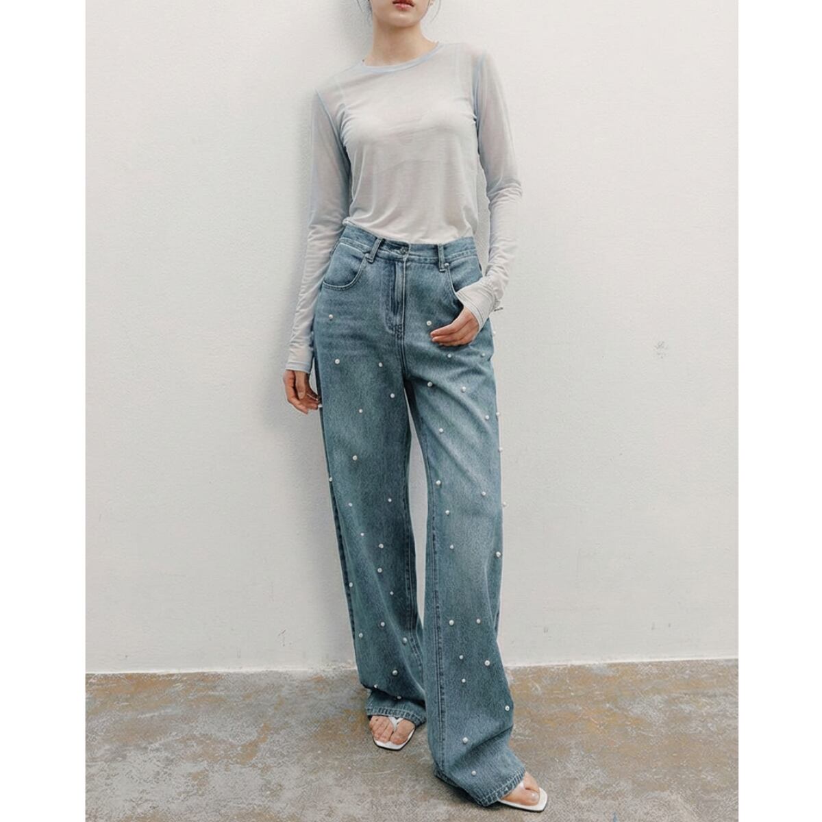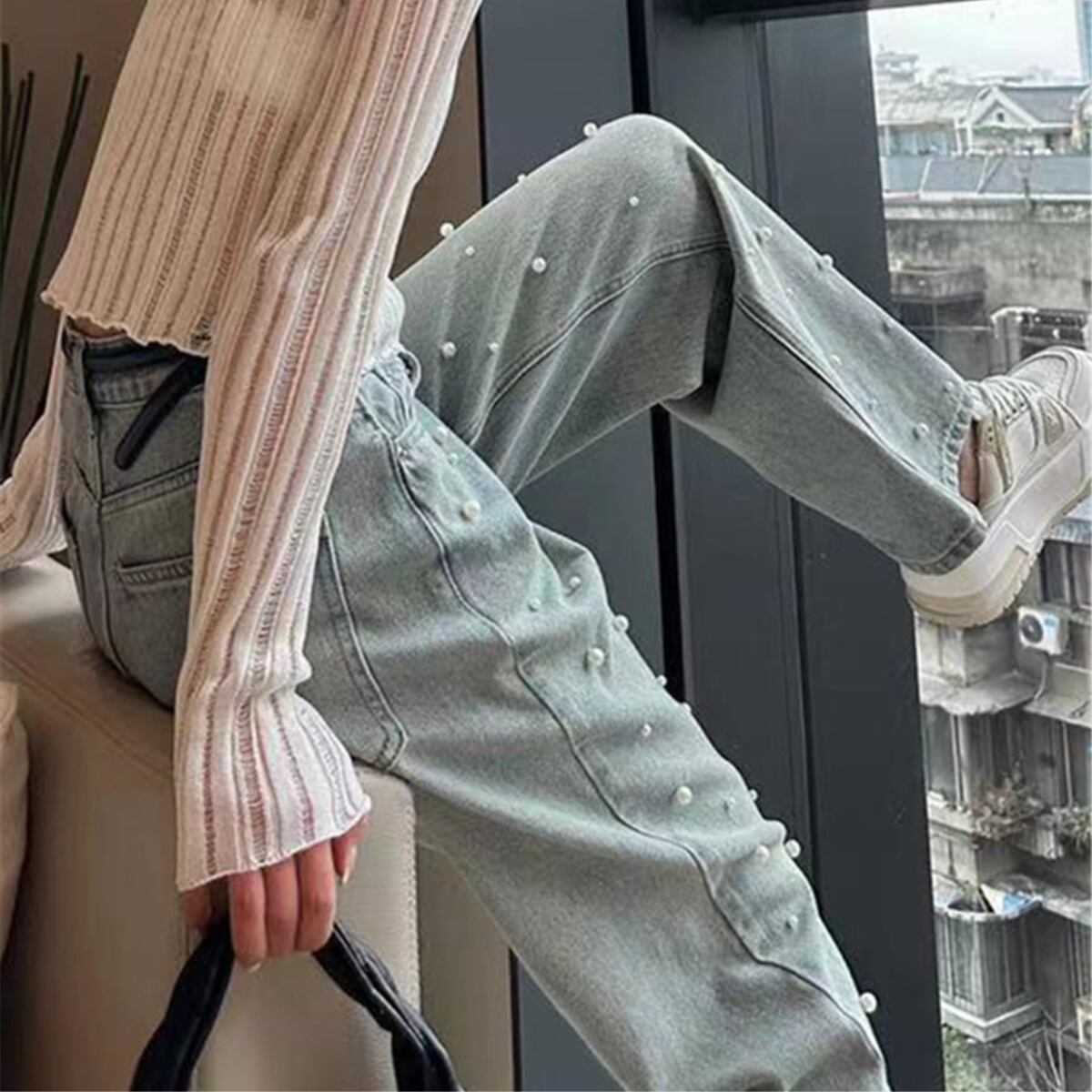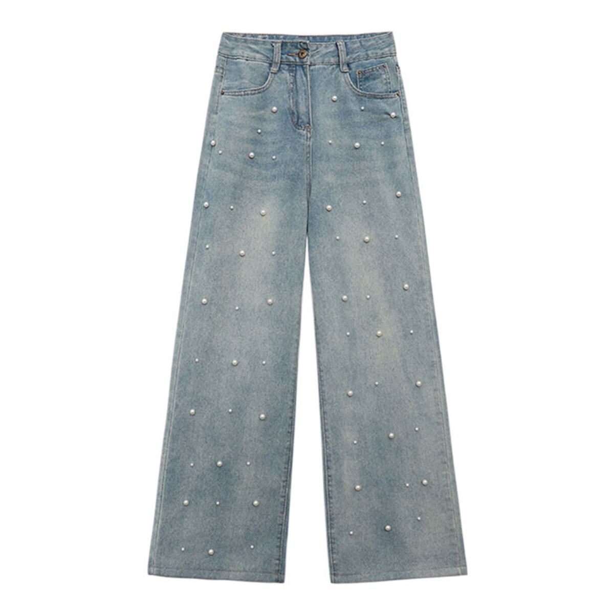 パール付き ハイウエスト デニムパンツ ストレート ジーンズ ch0435