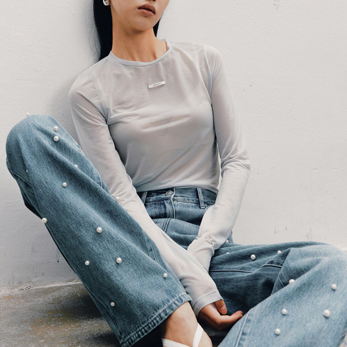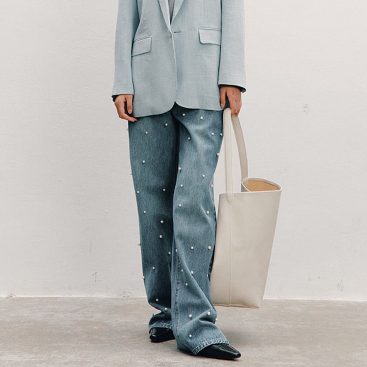 カジュアルなデニム素材に上品なパールをあしらうことで、大人フェミニンな印象に仕上げました。